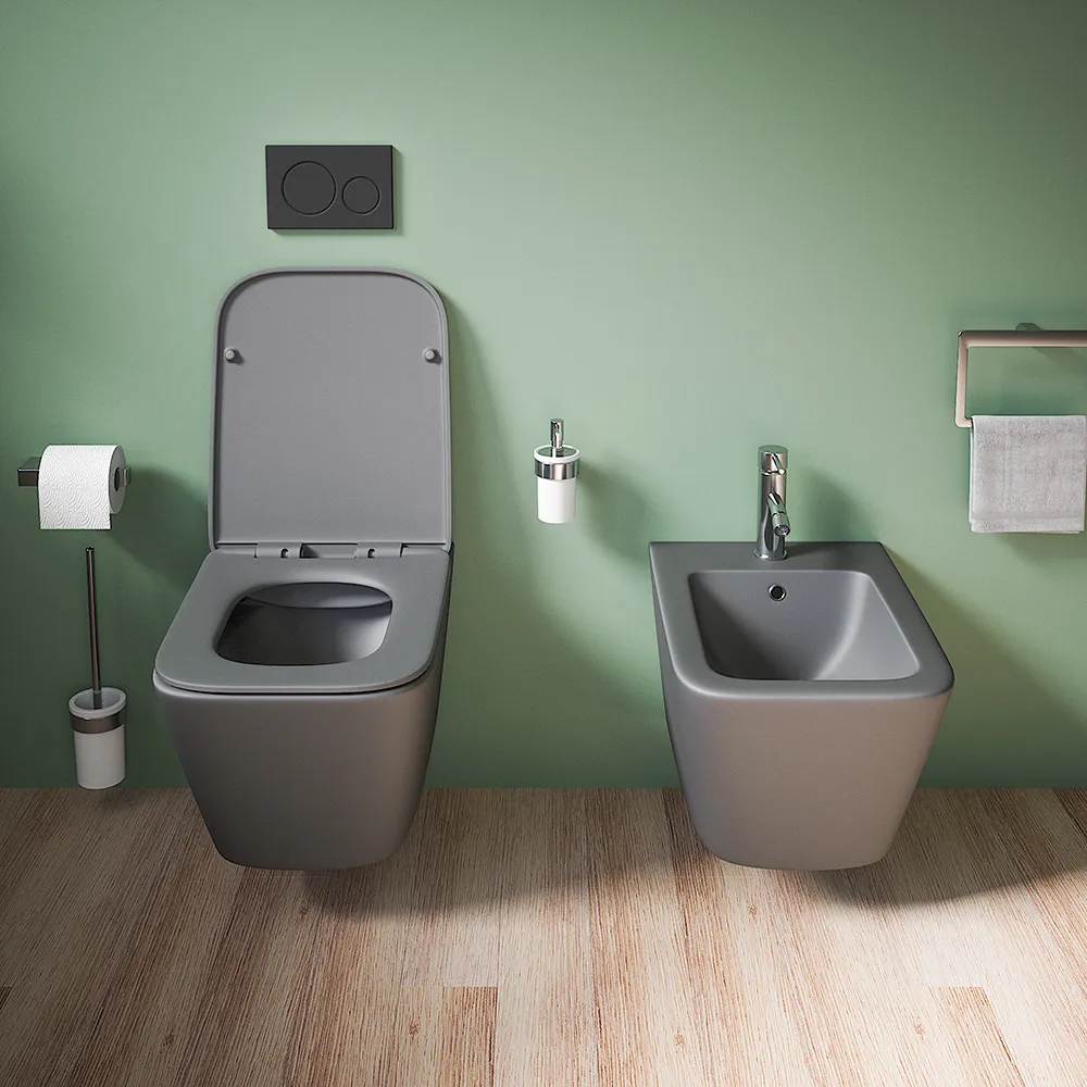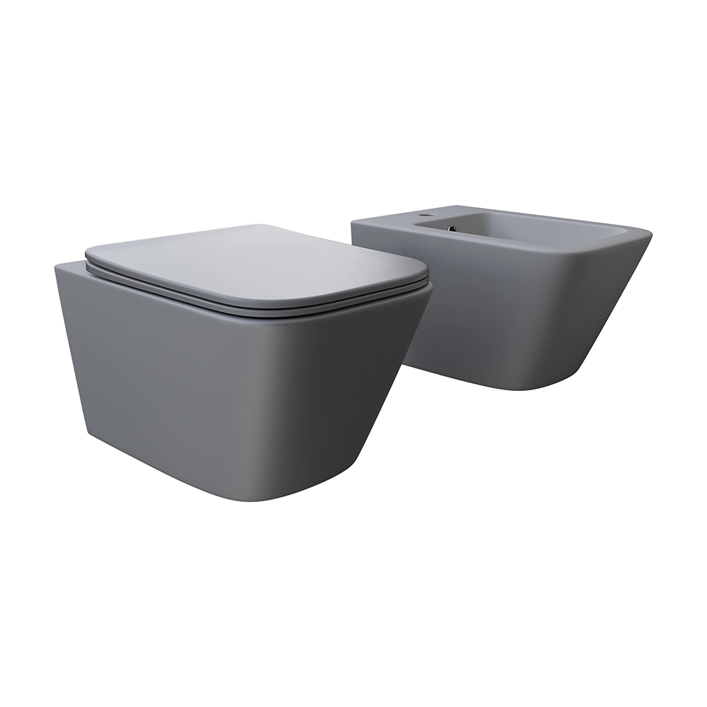 Coppia sanitari in ceramica sospesi vaso rimless, bidet e copri-wc grigio opaco | Kyoto