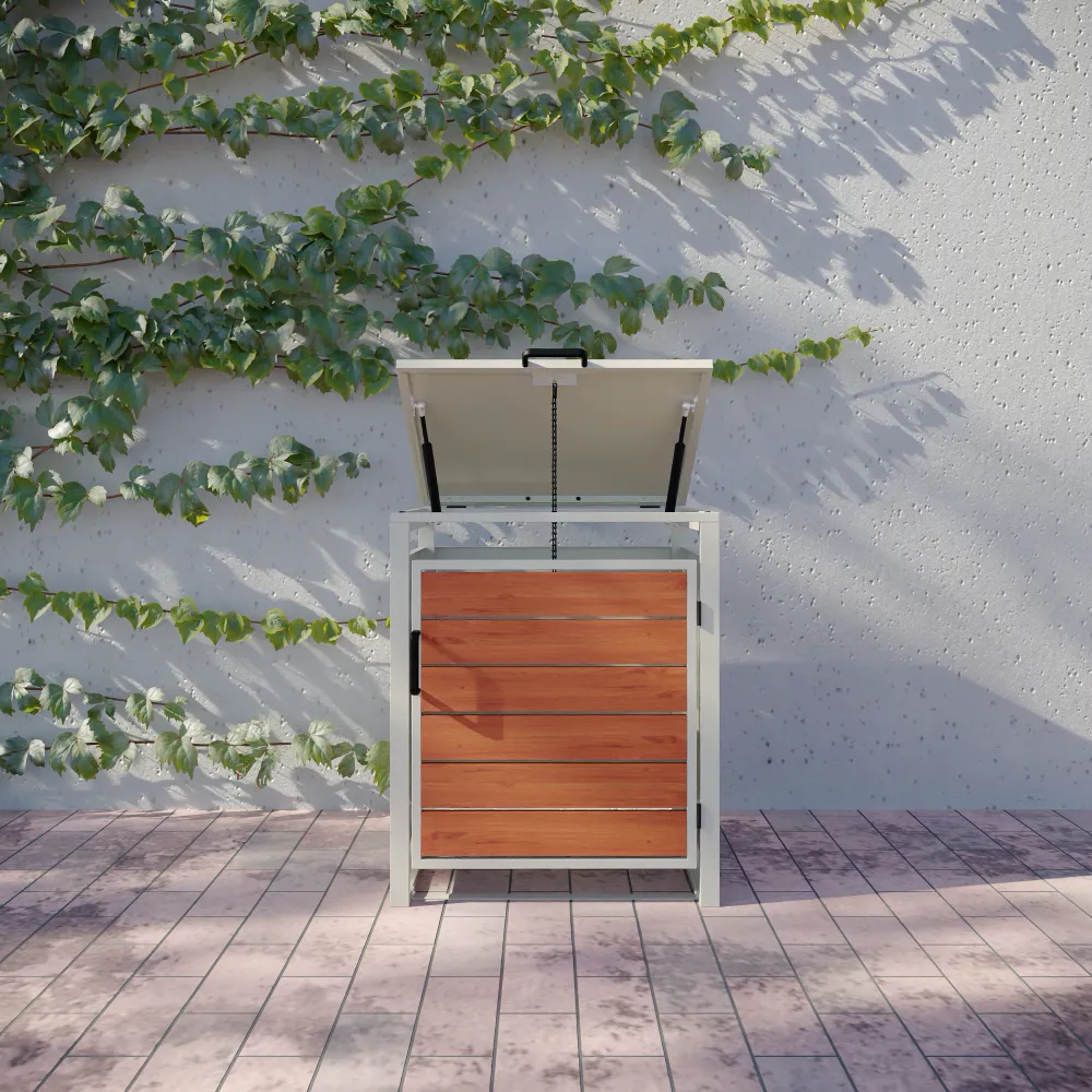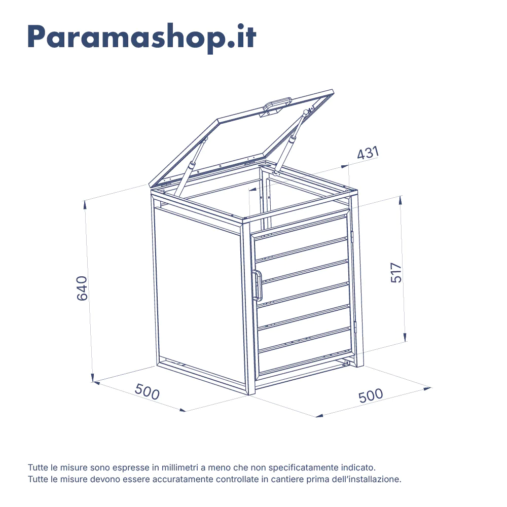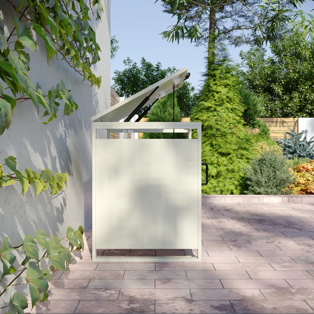 La stabilità del box a un posto è assicurata da un robusto telaio portante avente uno spessore di 0,8 mm. Con un ingombro esterno complessivo di 50 x 50 x 60 cm, il copribidone ottimizza lo spazio a disposizione, mantenendo l'area esterna pulita e ordinata.