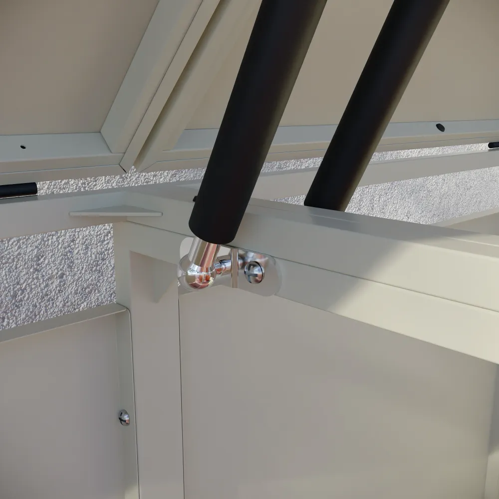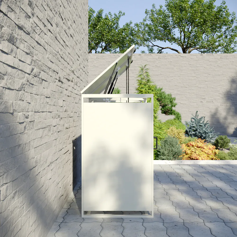 La stabilità del box a due posti è assicurata da un robusto telaio portante, costruito con tubolari da 15x15 mm e 15x30 mm aventi uno spessore di 0,8 mm. Con un ingombro esterno complessivo di 116 x 60 x 105 cm, il copribidone ottimizza lo spazio a disposizione, mantenendo l'area esterna pulita e ordinata.