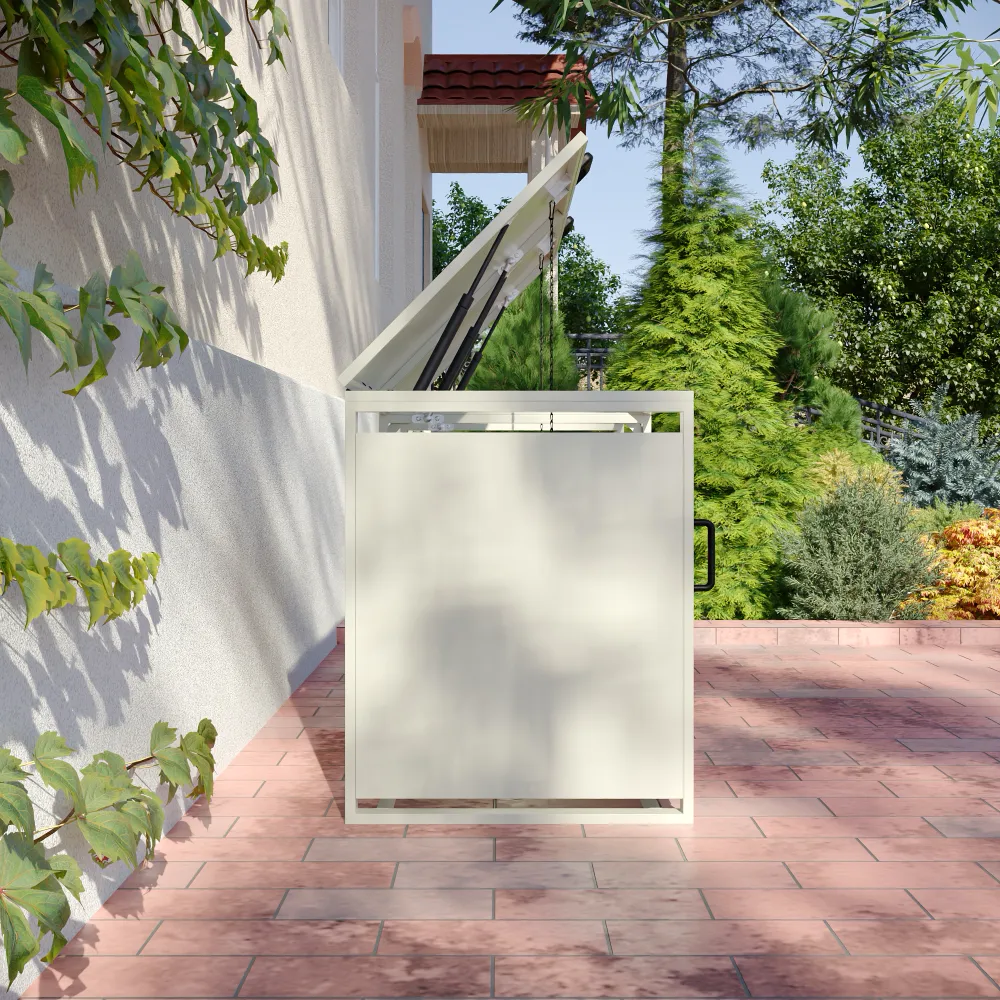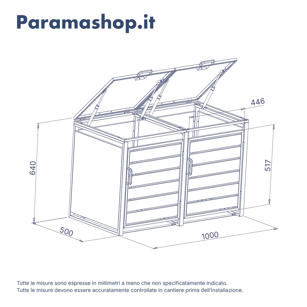La stabilità è assicurata da un robusto telaio portante avente uno spessore di 0,8 mm. Con un ingombro esterno complessivo di 100 x 50 x 64 cm, il copribidone ottimizza lo spazio a disposizione, mantenendo l'area esterna pulita e ordinata.