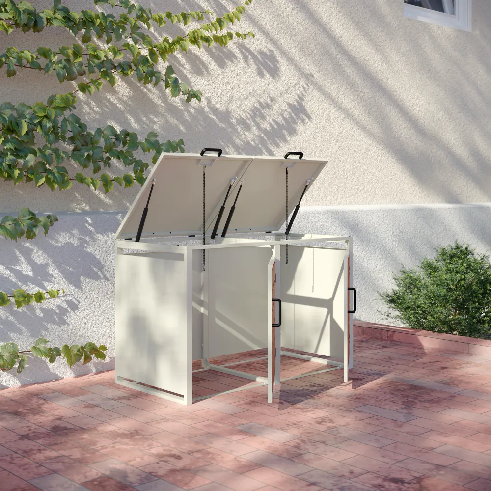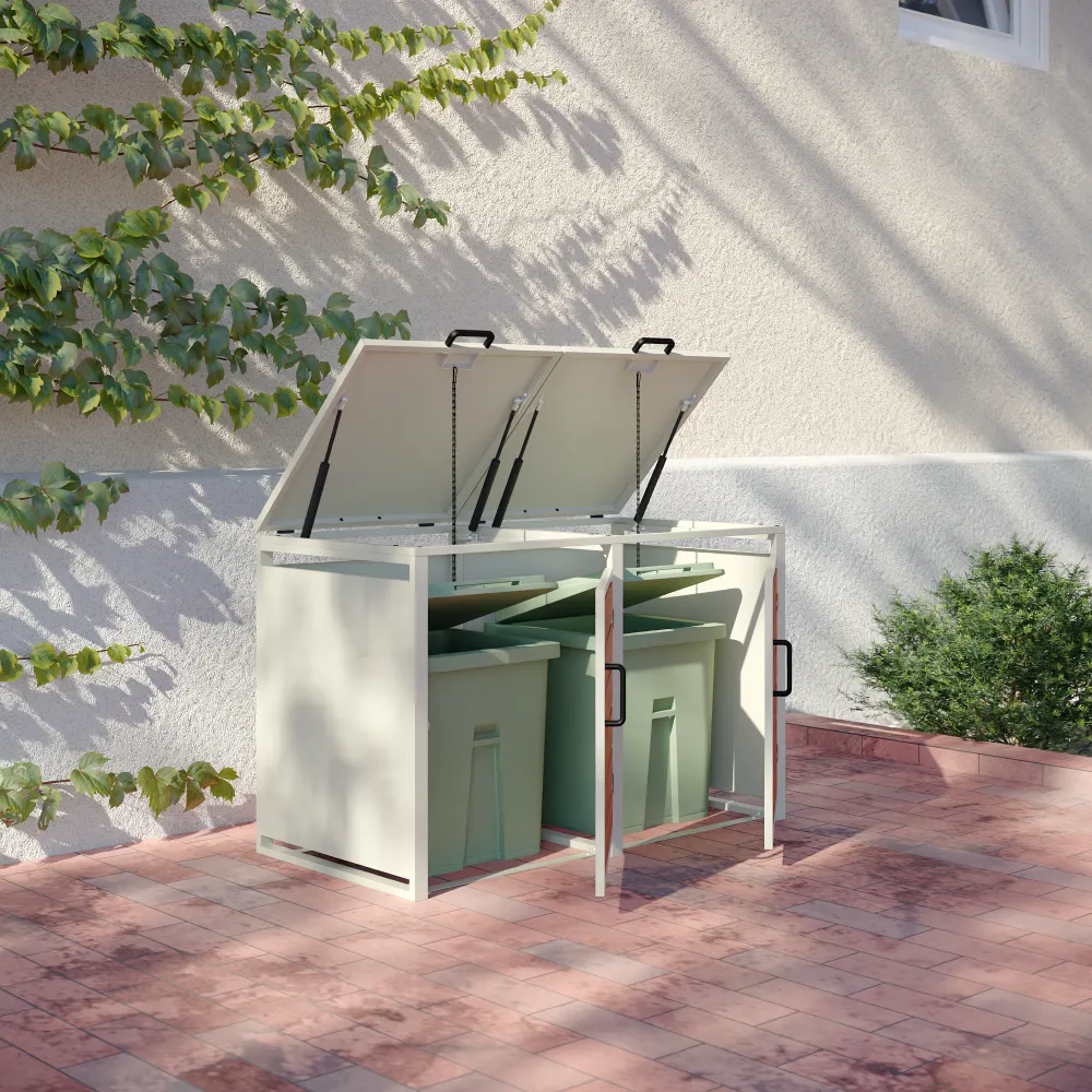 Questo copribidone doppio in acciaio zincato è progettato per contenere due cassonetti da 60 litri. La struttura offre una soluzione pratica e discreta per organizzare e nascondere l'area dedicata alla raccolta differenziata negli spazi esterni.
