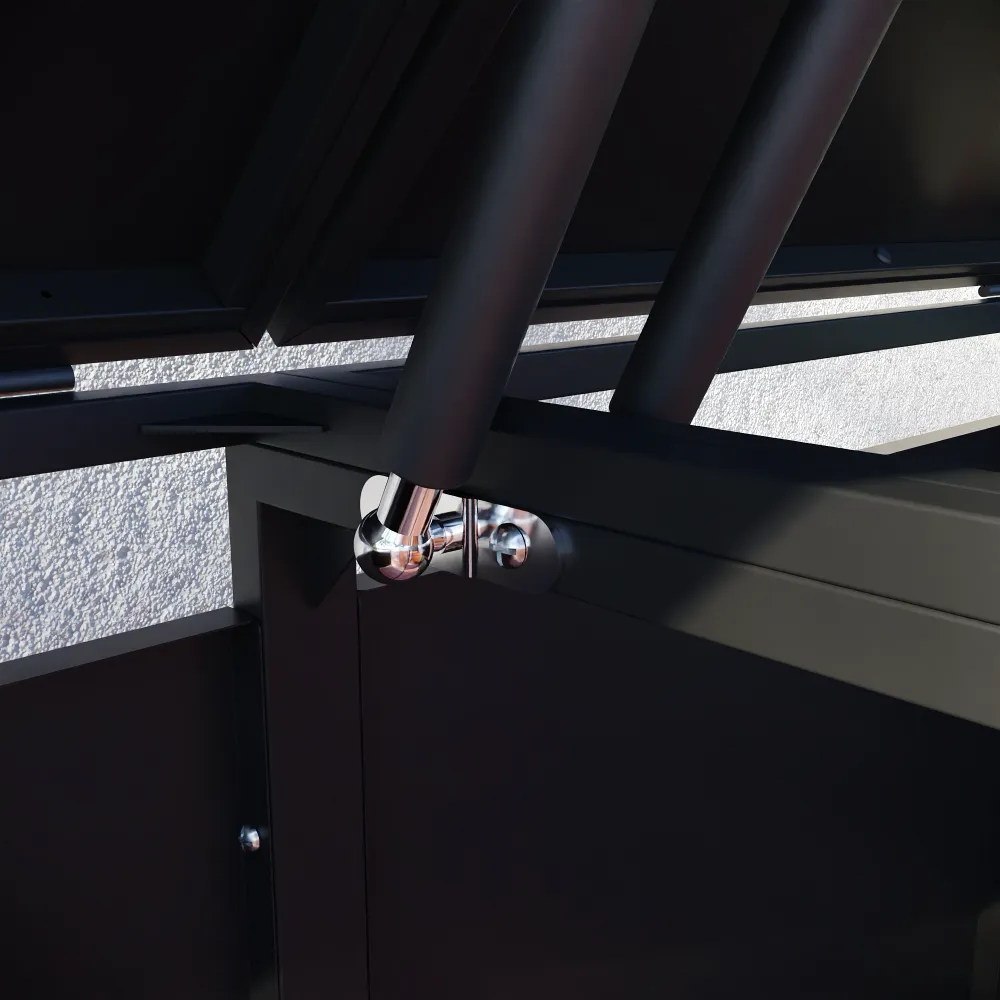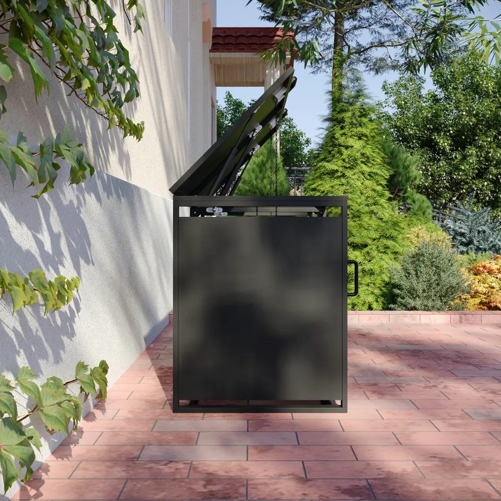 La stabilità è assicurata da un robusto telaio portante avente uno spessore di 0,8 mm. Con un ingombro esterno complessivo di 100 x 50 x 64 cm, il copribidone ottimizza lo spazio a disposizione, mantenendo l'area esterna pulita e ordinata.