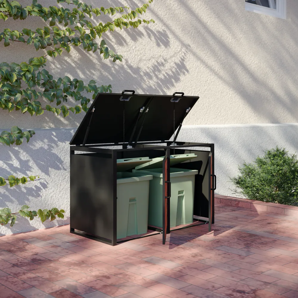 Questo copribidone doppio in acciaio zincato è progettato per contenere due cassonetti da 60 litri. La struttura offre una soluzione pratica e discreta per organizzare e nascondere l'area dedicata alla raccolta differenziata negli spazi esterni.