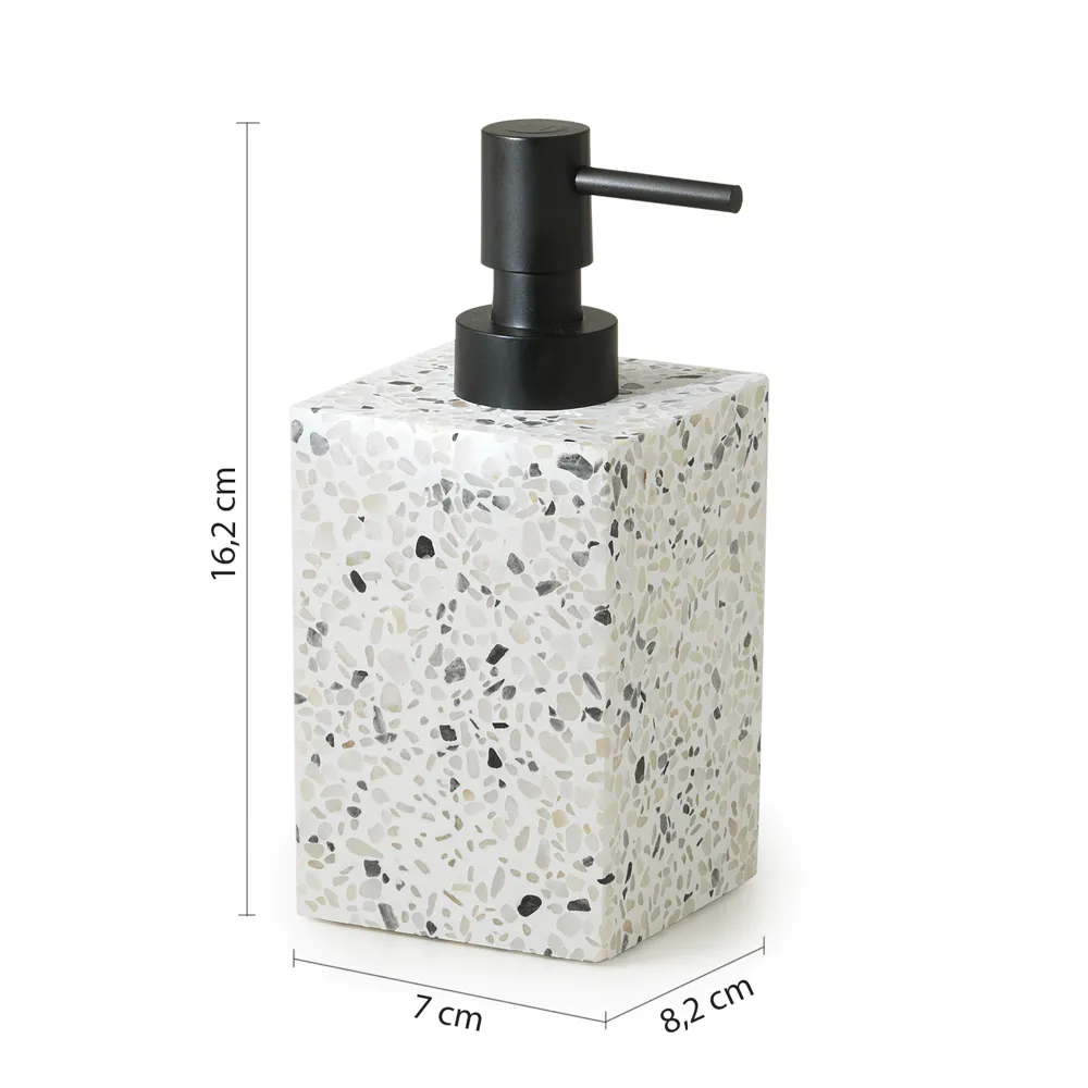 Il dispenser sapone della linea Zoe da appoggio si caratterizza per la finitura in graniglia marmo bianco/nero, realizzato con materiali naturali come resina e pietre ed un erogatore in plastica nero opaco. Elegante e funzionale, questo dispenser unisce stile e praticità, ideale per ambienti bagno moderni che vogliono un tocco naturale e raffinato.