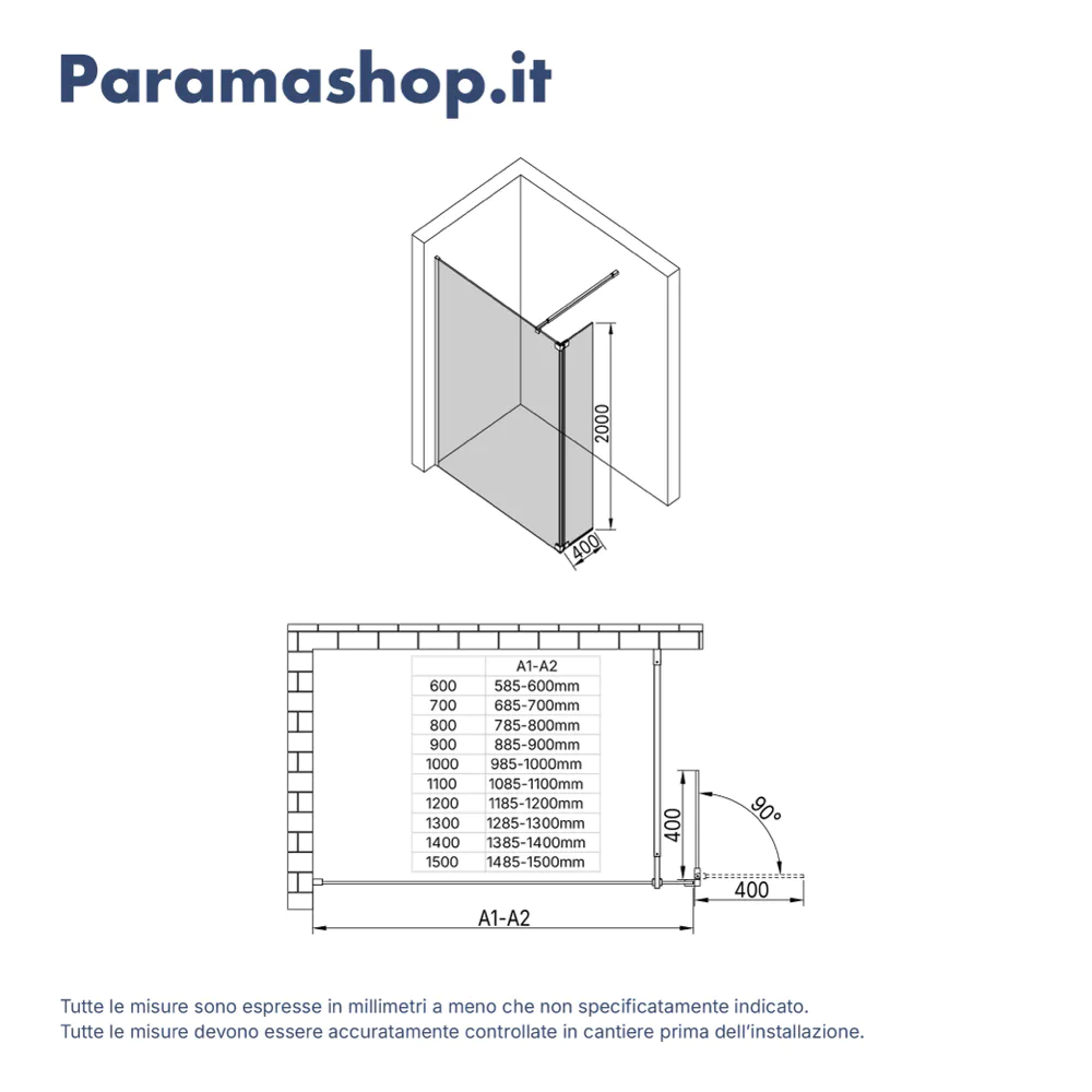 L'installazione è reversibile dunque il walk-in Naxos può essere installato sia con orientamento a destra, sia con orientamento a sinistra. Il montaggio può avvenire direttamente a pavimento o in appoggio su piatto doccia. Grazie alla tolleranza di 1,5cm, sarà possibile procedere all'installazione anche in caso di piccoli fuori squadro.