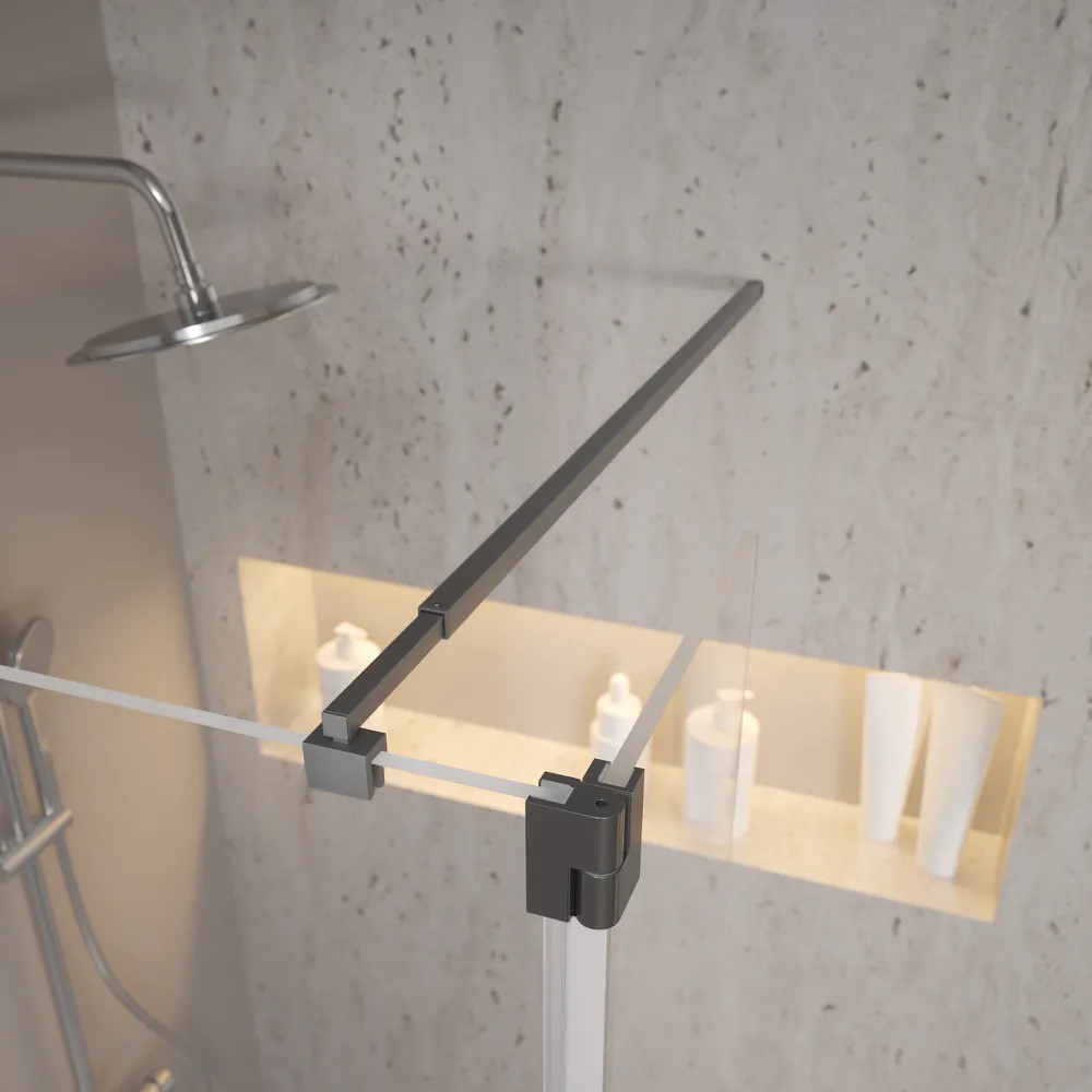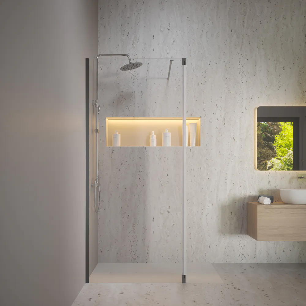 La parete doccia Keros è dotata di un'anta girevole paraspruzzi da 40 cm. Questo componente aggiuntivo offre versatilità nel tuo utilizzo quotidiano della doccia, consentendo di evitare schizzi d'acqua indesiderati nel resto del bagno.