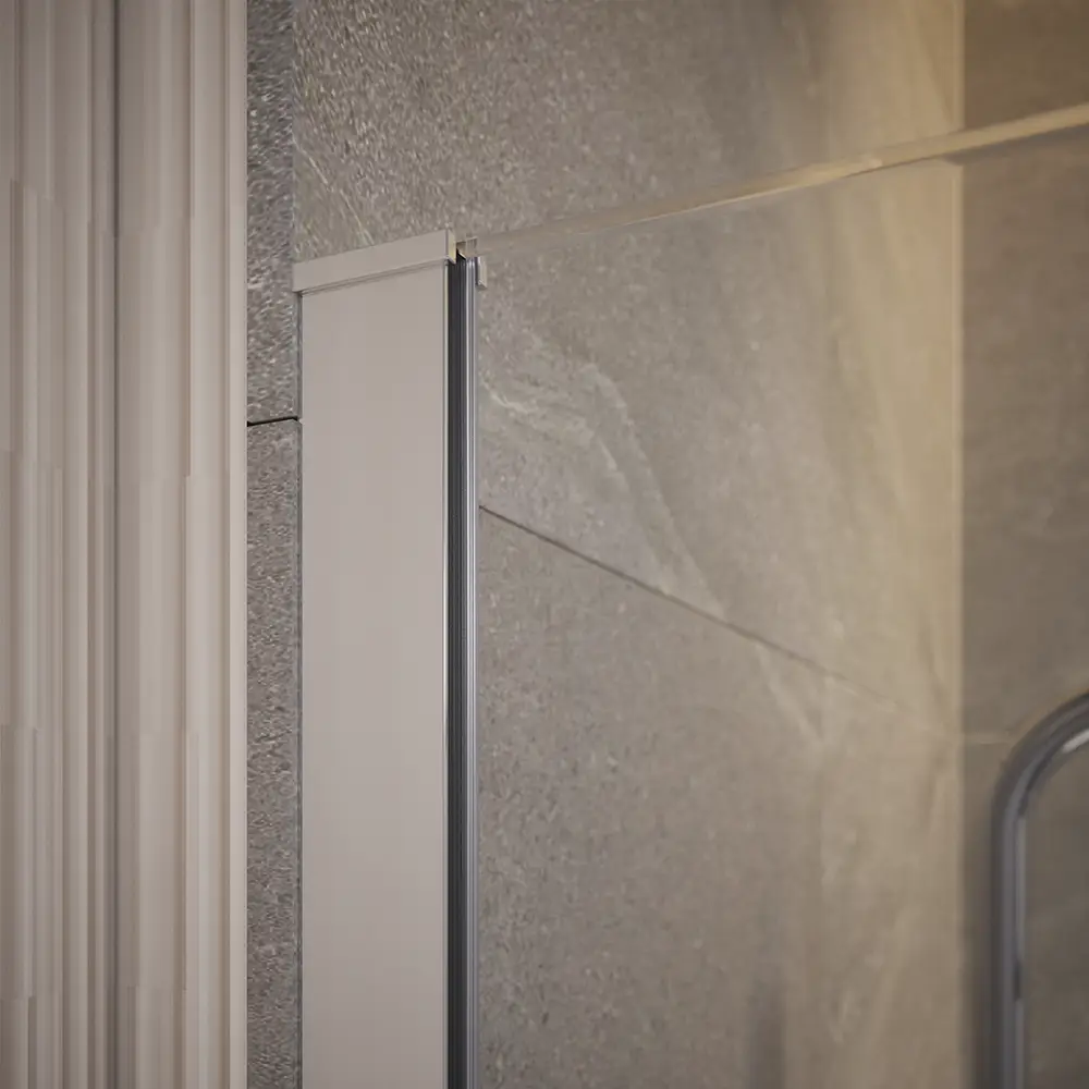 La parete doccia Naxos è dotata di un'anta girevole paraspruzzi da 30 cm. Questo componente aggiuntivo offre versatilità nel tuo utilizzo quotidiano della doccia, consentendo di evitare schizzi d'acqua indesiderati nel resto del bagno.