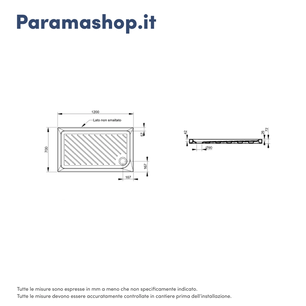 Il piatto doccia Gemma 70x120cm è installabile soltanto in appoggio con foro per l'installazione della piletta di scarico posizionato sull'angolo esterno destro.