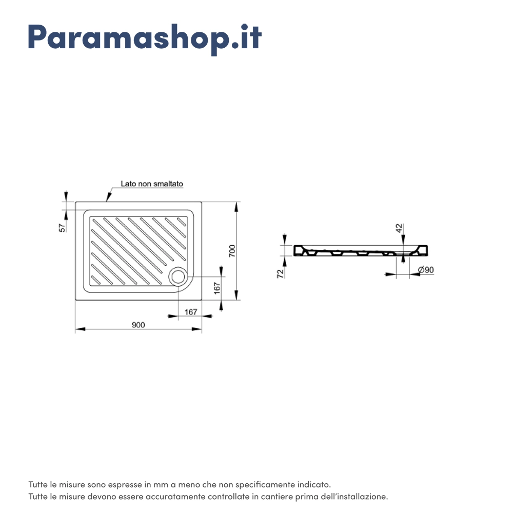 Il piatto doccia Gemma 70x90cm è installabile soltanto in appoggio con foro per l'installazione della piletta di scarico posizionato sull'angolo esterno destro.