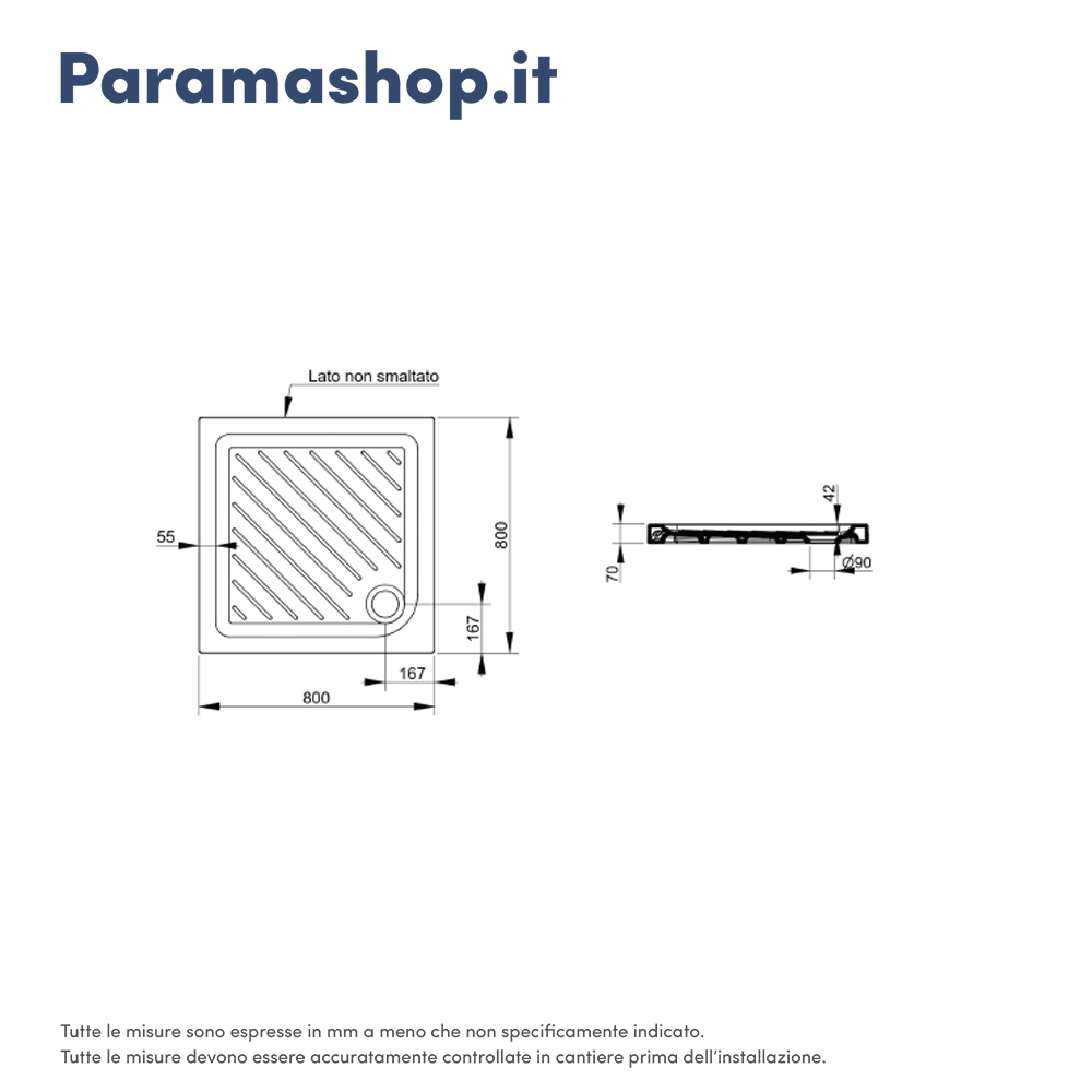 Il piatto doccia Gemma 80x80cm è installabile soltanto in appoggio con foro per l'installazione della piletta di scarico posizionato sull'angolo esterno destro.
