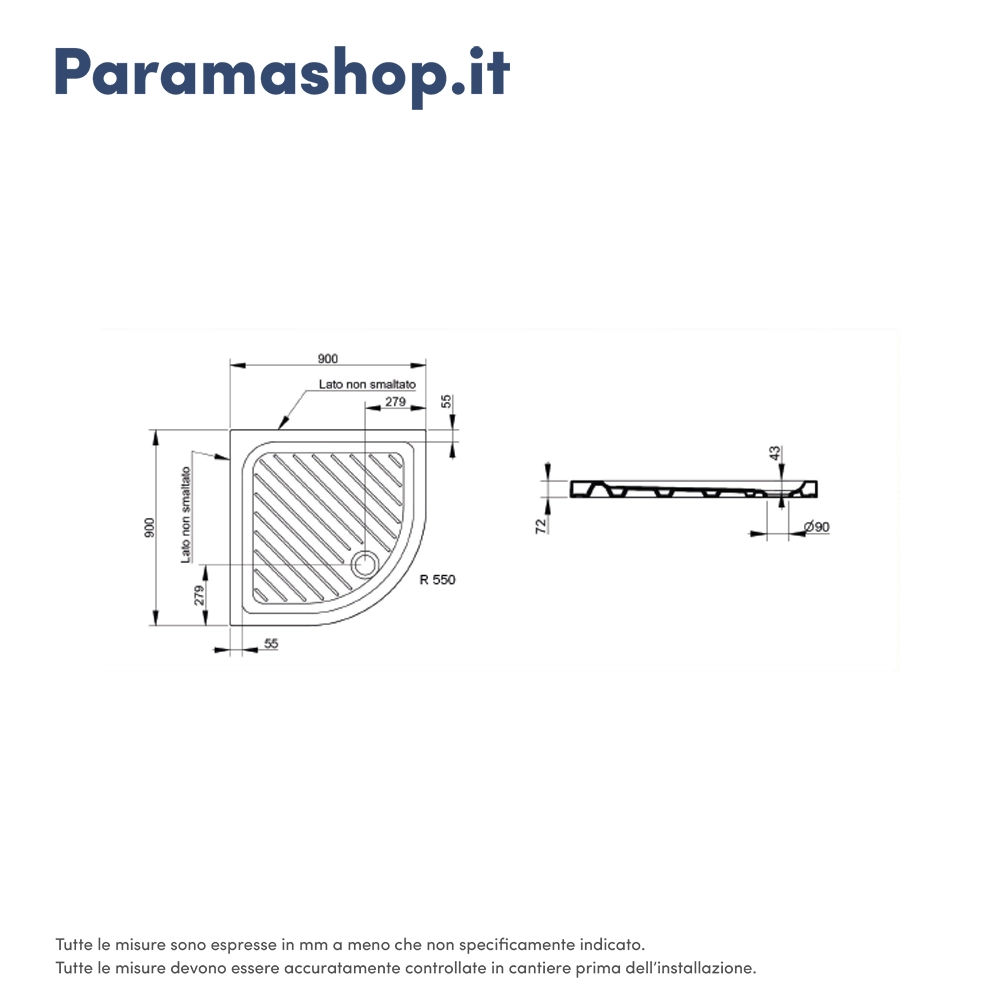 Il piatto doccia Gemma semicircolare 90x90cm è installabile soltanto in appoggio con foro per l'installazione della piletta di scarico posizionato frontalmente.
