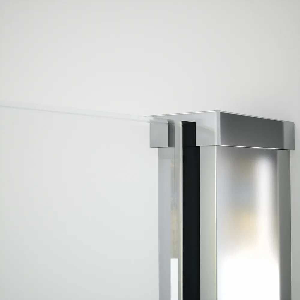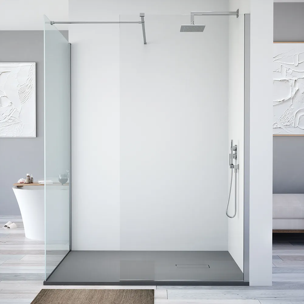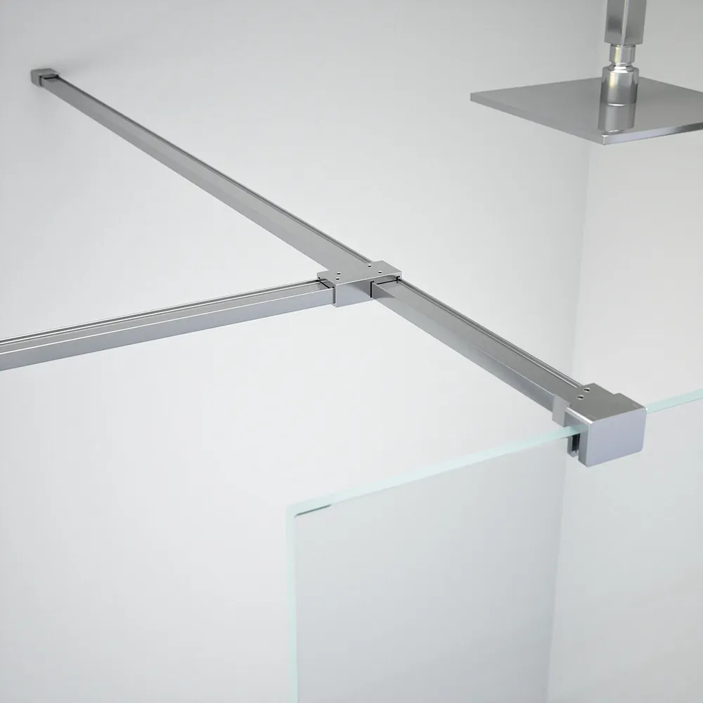 Il box doccia walk-in a due pareti con supporto superiore a T presenta una struttura, essenziale e sofisticata, disinguendosi per un elegante gioco di forme, capace di valorizzare qualsiasi ambiente bagno.
