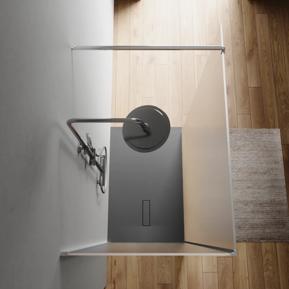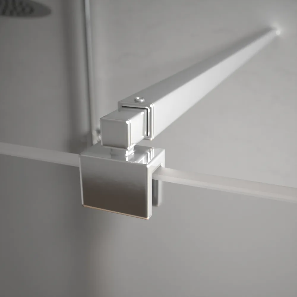 Il braccio telescopico in acciaio inox, regolabile da 65 a 120 cm, garantisce la stabilità della struttura e permette di adattare con precisione il box alle dimensioni del piatto doccia o dell’area a filo pavimento. L’installazione reversibile consente di montarlo facilmente sia con apertura a destra che a sinistra, offrendo massima libertà progettuale.