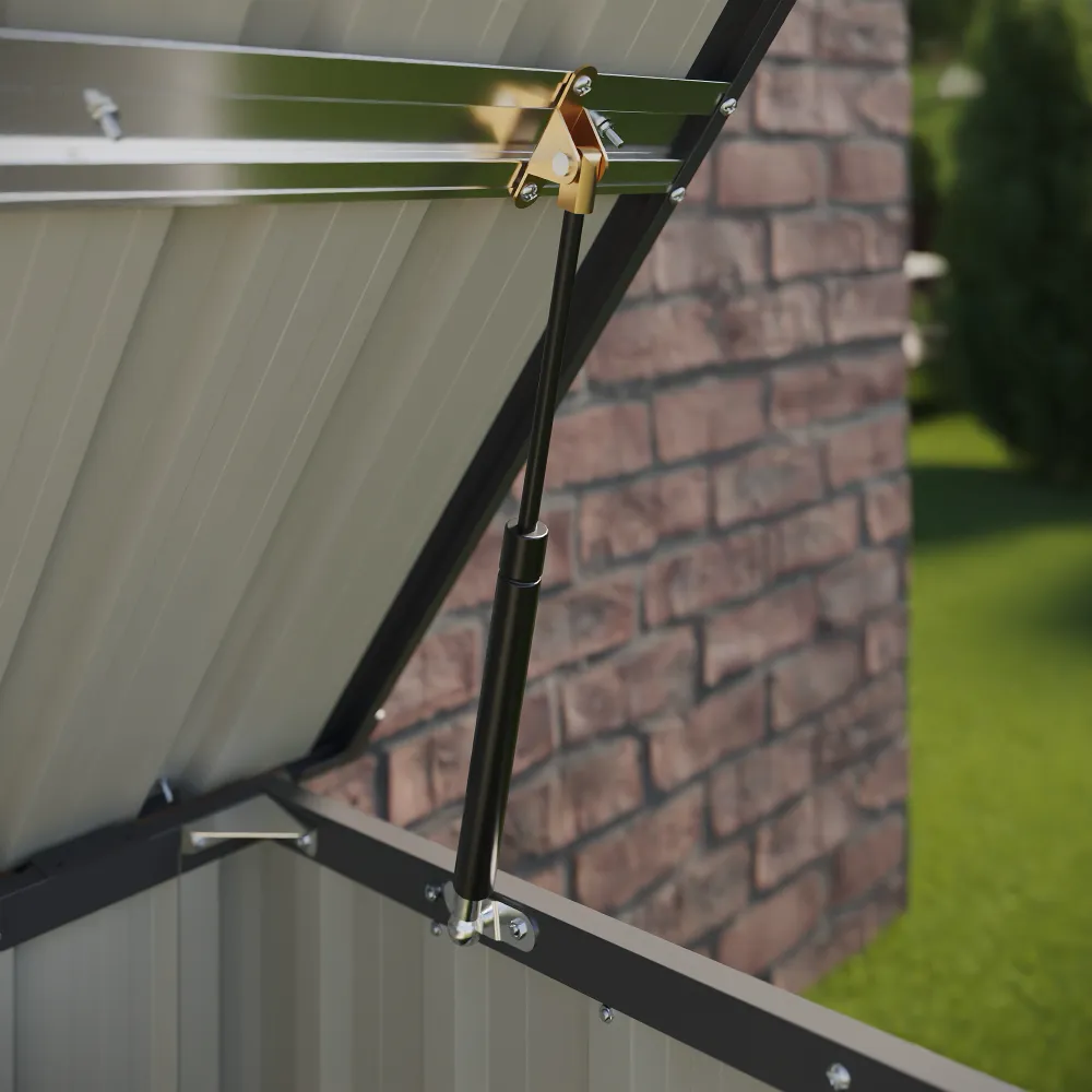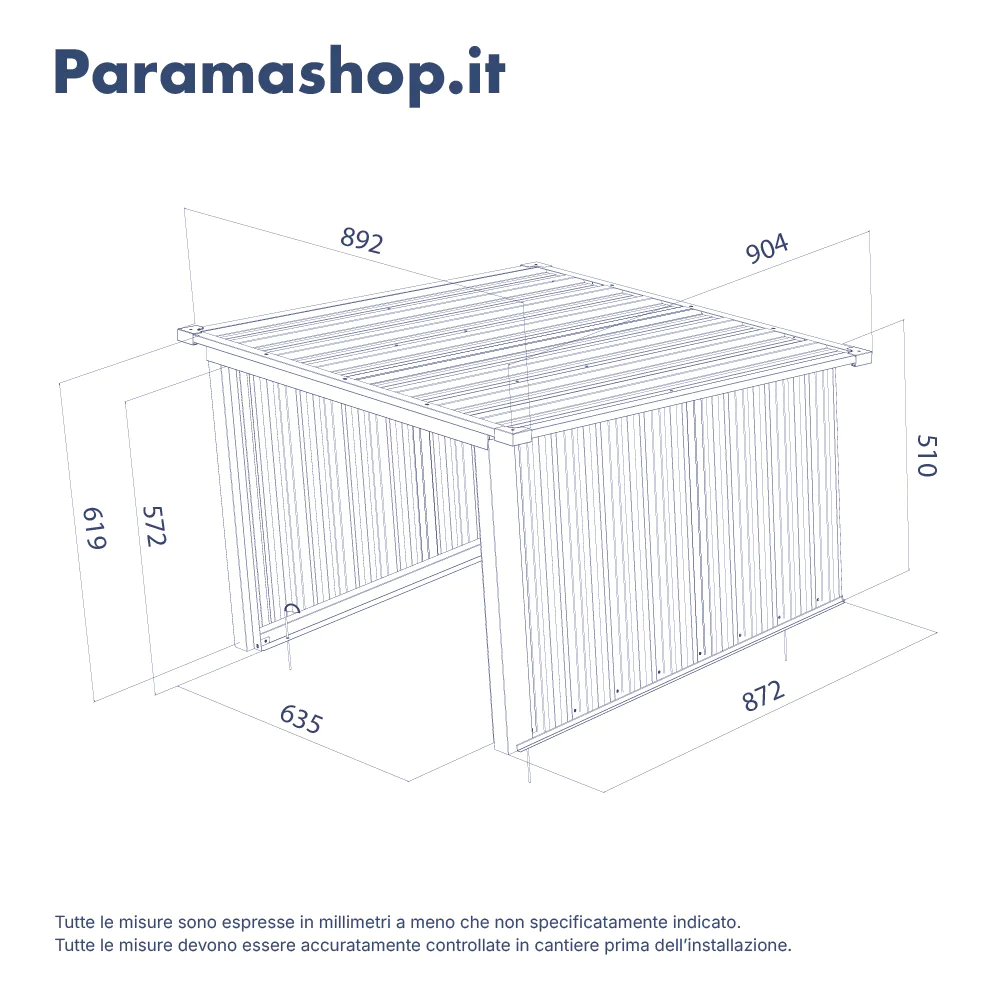 Il tetto spiovente (con altezza che scende da 62 cm a 51 cm sul retro) assicura il rapido deflusso dell'acqua piovana e della neve, mantenendo il vano interno sempre ben protetto e asciutto.