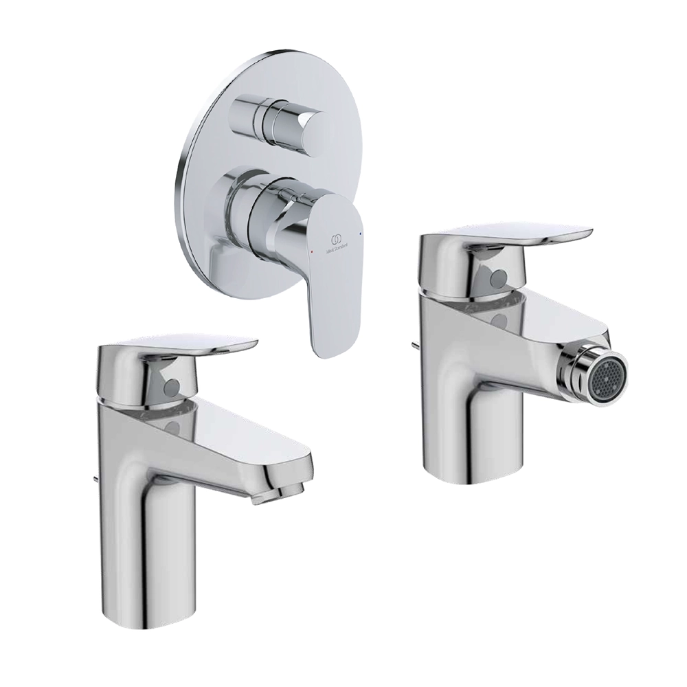 Il set completo di miscelatori lavabo e bidet scarico automatico ed incasso doccia con deviatore a 2 vie Ceraflex di Ideal Standard è la soluzione ideale per chi cerca affidabilità, design elegante e prestazioni superiori.