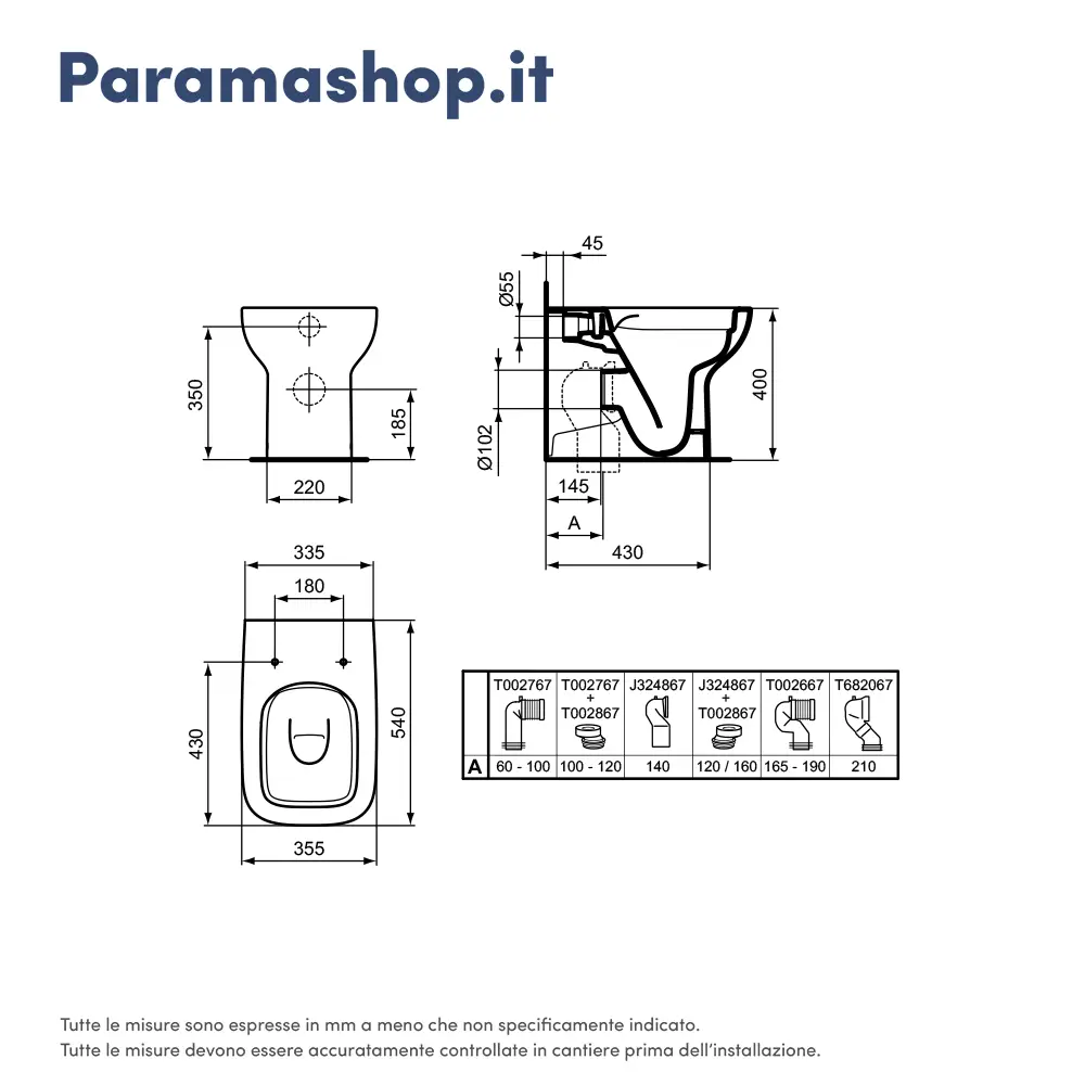 Grazie allo scarico traslato che copre distanze dal muro comprese tra i 60 e i 200 mm (attraverso le apposite curve tecniche da ordinare separatamente ) questo vaso filomuro può essere installato senza dover apportare delle modifiche agli impianti esistenti. I fissaggi a pavimento sono inclusi nella confezione.