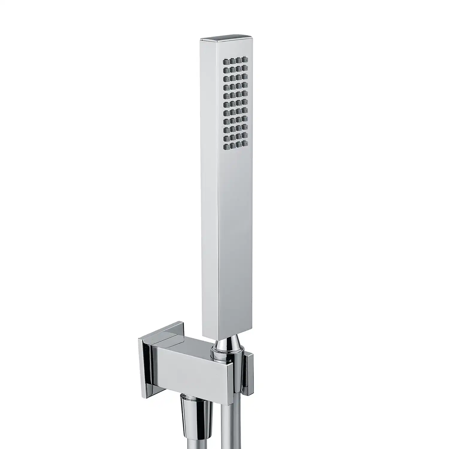 Set completo squadrato per la doccia: doccino e supporto a muro con presa acqua in ottone cromato e flessibile da 150 cm in pvc silver anti-torsione.
