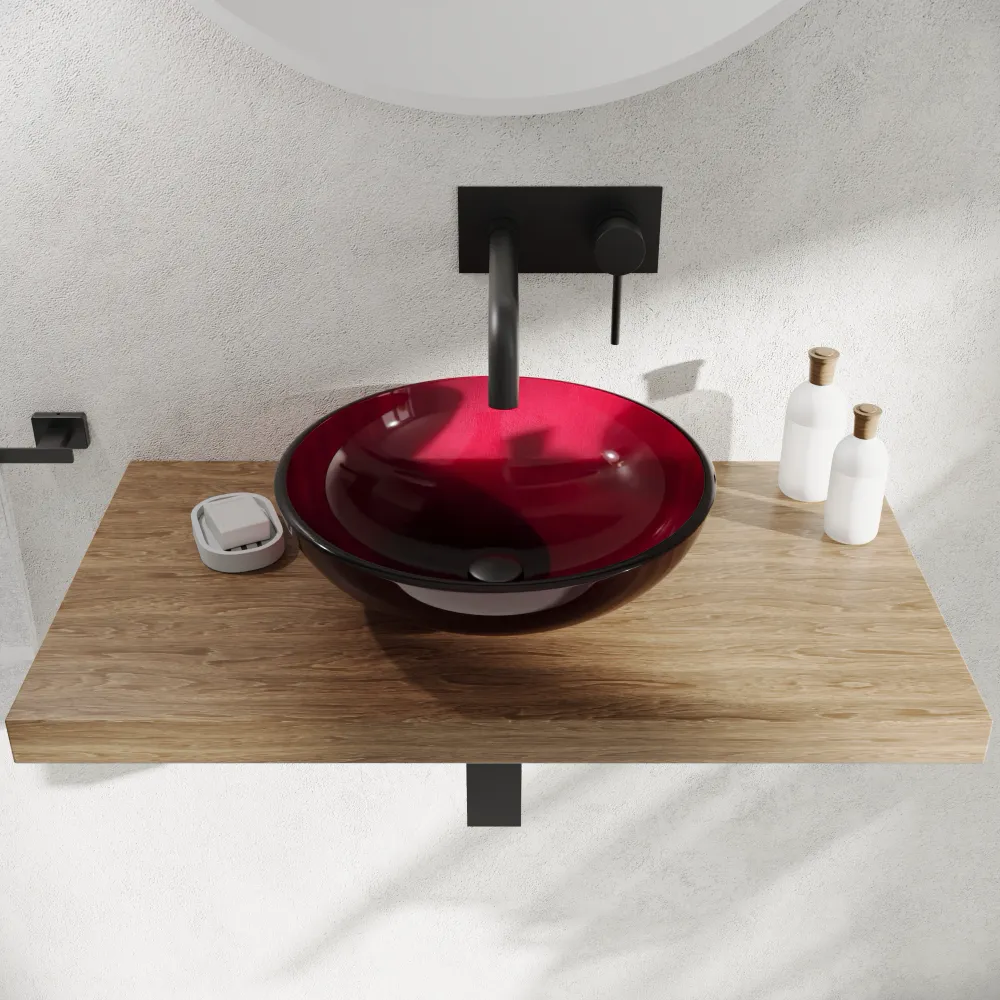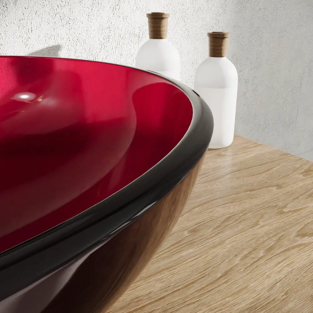 Il lavabo d'appoggio in vetro Aurea è la soluzione ideale per chi desidera donare carattere, freschezza e leggerezza al proprio ambiente bagno. La sua affascinante finitura bordeaux trasparente crea raffinati giochi di luce e riflessi sull'acqua, trasformando la zona lavabo in un vero e proprio elemento di design.