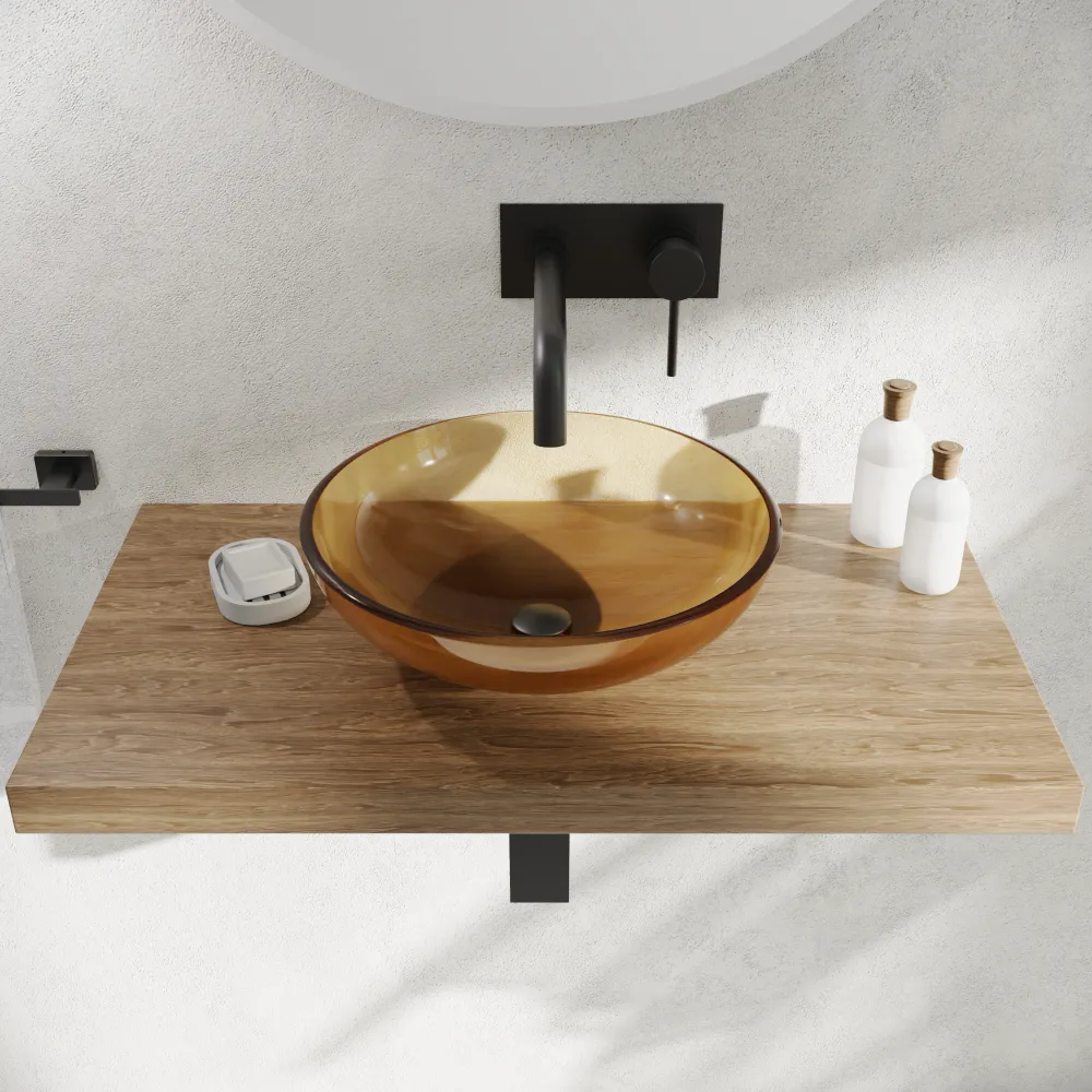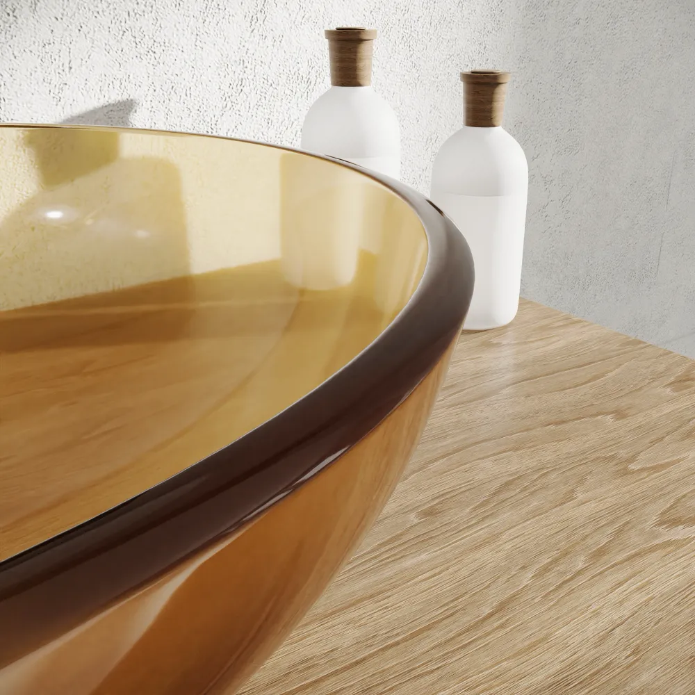 Il lavabo d'appoggio in vetro Aurea è la soluzione ideale per chi desidera donare carattere, freschezza e leggerezza al proprio ambiente bagno. La sua affascinante finitura giallo trasparente crea raffinati giochi di luce e riflessi sull'acqua, trasformando la zona lavabo in un vero e proprio elemento di design.