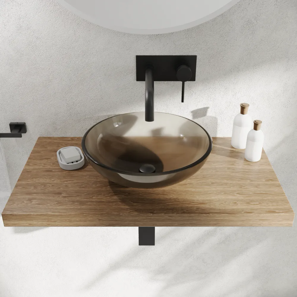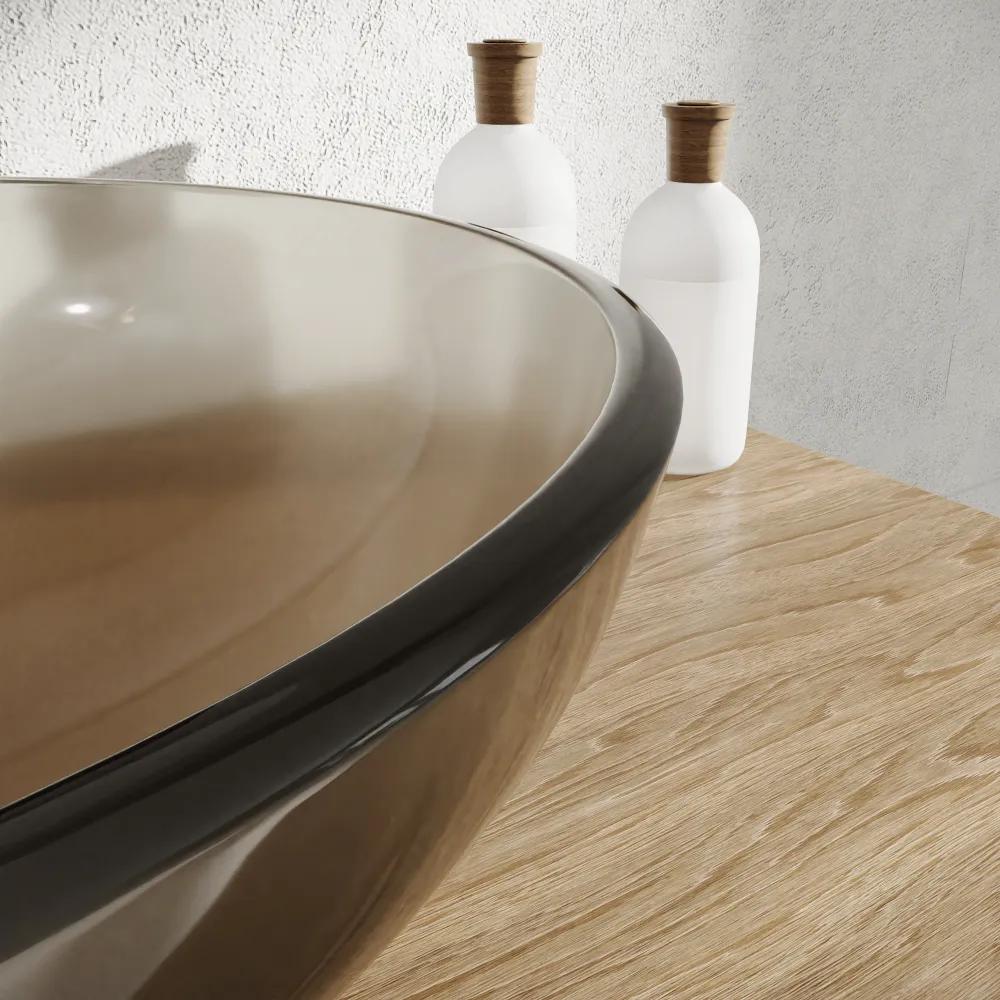 Il lavabo d'appoggio in vetro Aurea è la soluzione ideale per chi desidera donare carattere, freschezza e leggerezza al proprio ambiente bagno. La sua affascinante finitura marrone trasparente crea raffinati giochi di luce e riflessi sull'acqua, trasformando la zona lavabo in un vero e proprio elemento di design.