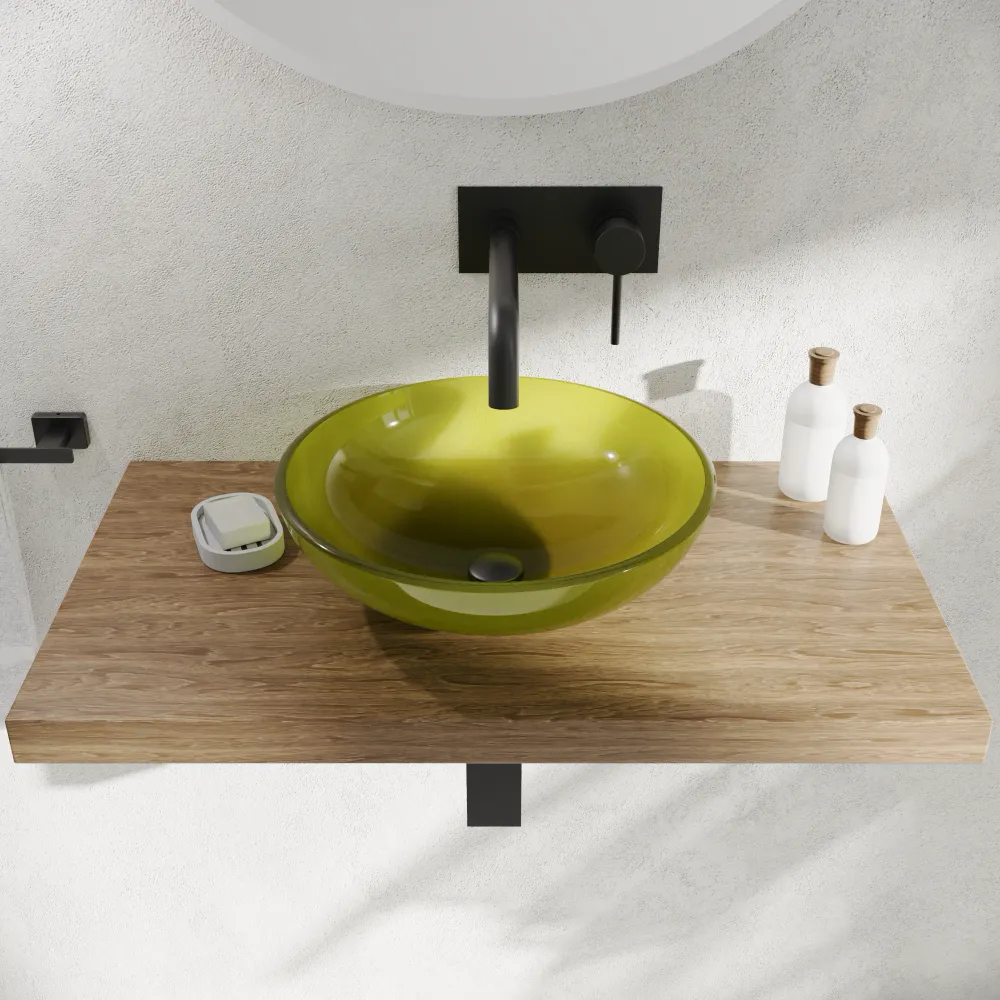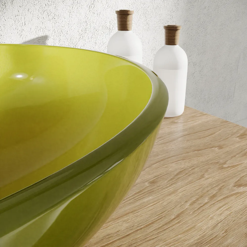 Il lavabo d'appoggio in vetro Aurea è la soluzione ideale per chi desidera donare carattere, freschezza e leggerezza al proprio ambiente bagno. La sua affascinante finitura verde trasparente crea raffinati giochi di luce e riflessi sull'acqua, trasformando la zona lavabo in un vero e proprio elemento di design.
