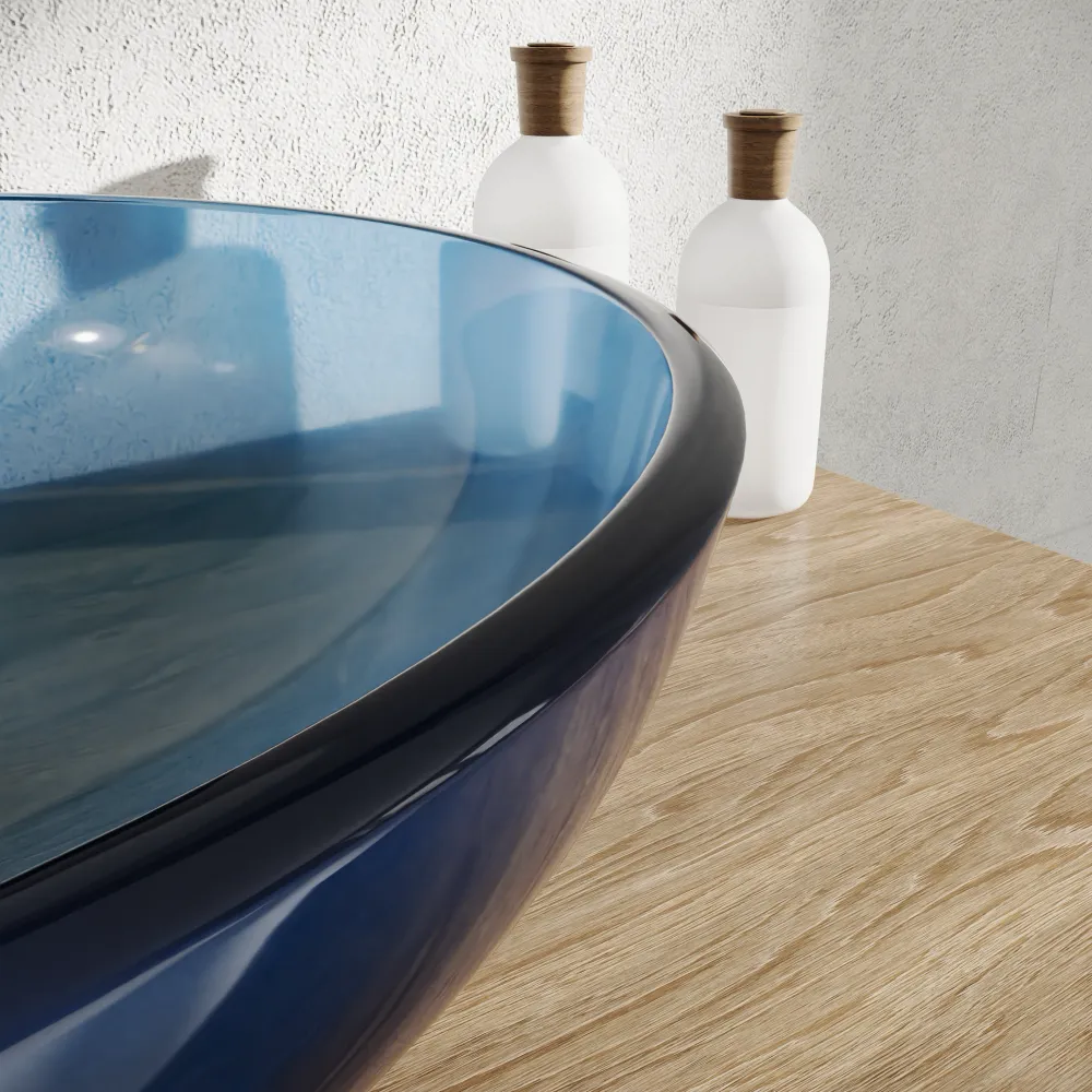 Il lavabo d'appoggio in vetro Aurea è la soluzione ideale per chi desidera donare carattere, freschezza e leggerezza al proprio ambiente bagno. La sua affascinante finitura blu trasparente crea raffinati giochi di luce e riflessi sull'acqua, trasformando la zona lavabo in un vero e proprio elemento di design.