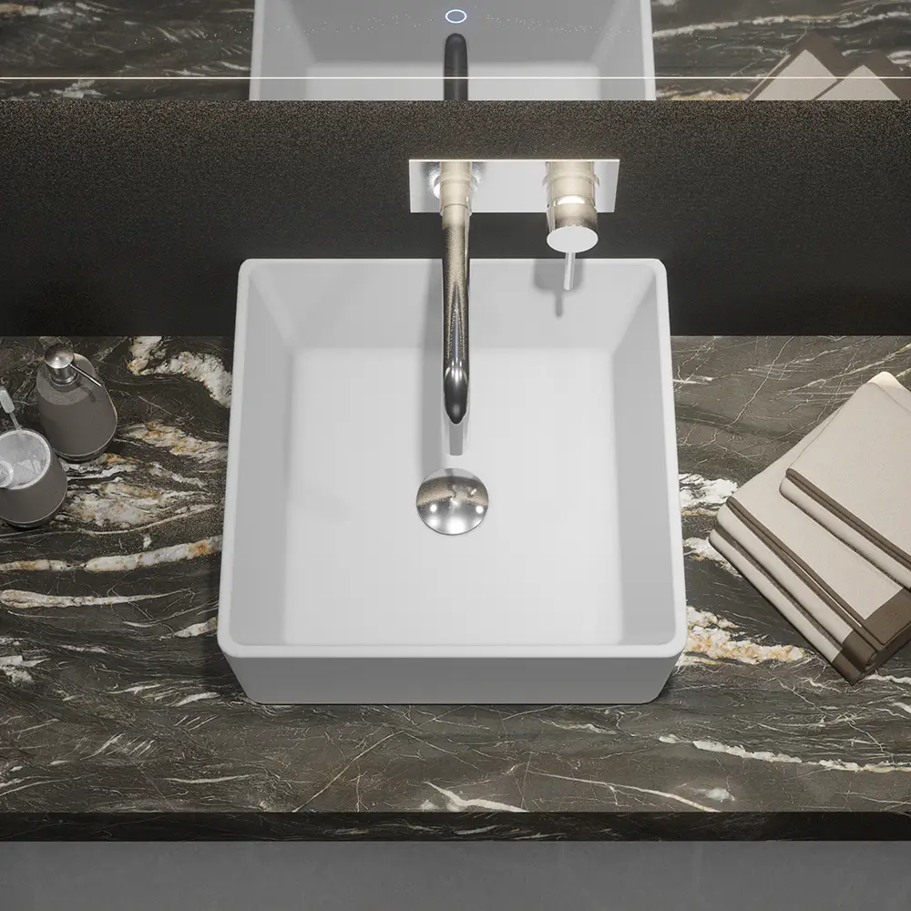Un lavabo d’appoggio con una forma quadrata, ben definita e con linee slanciate per riformulare completamente l’atmosfera nel tuo bagno