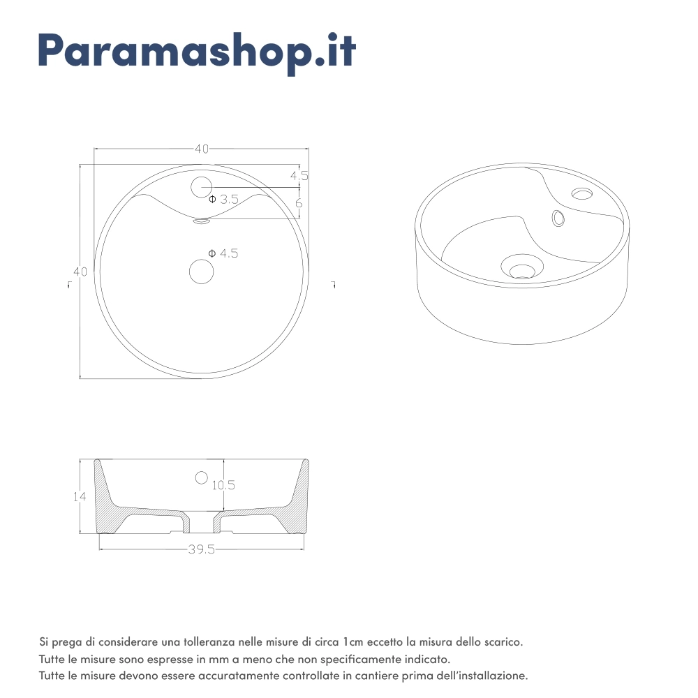 Lavabo da appoggio tondo con troppopieno 40x40x14 cm Bianco