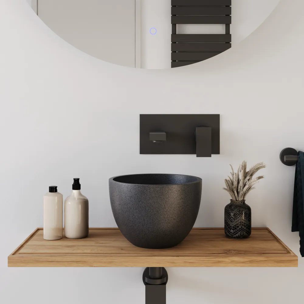 Il lavabo da appoggio Sevan è un modello compatto e di grande impatto estetico, realizzato in microcemento nero con una elegante finitura opaca effetto cemento. La sua forma tonda e il design essenziale si adattano perfettamente a bagni moderni, minimalisti o industrial chic, aggiungendo un tocco di stile sobrio e raffinato.