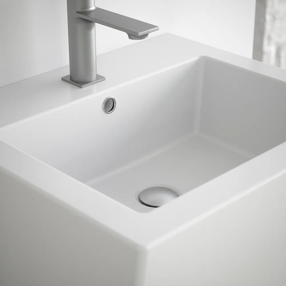 Ispirato alle tendenze più attuali del design d'interni, il lavabo modello Kara presenta una forma squadrata che esprime un'estetica minimalista e contemporanea. La sua semplicità formale lo rende un elemento versatile, perfetto per arredare bagni dal gusto moderno e raffinato.