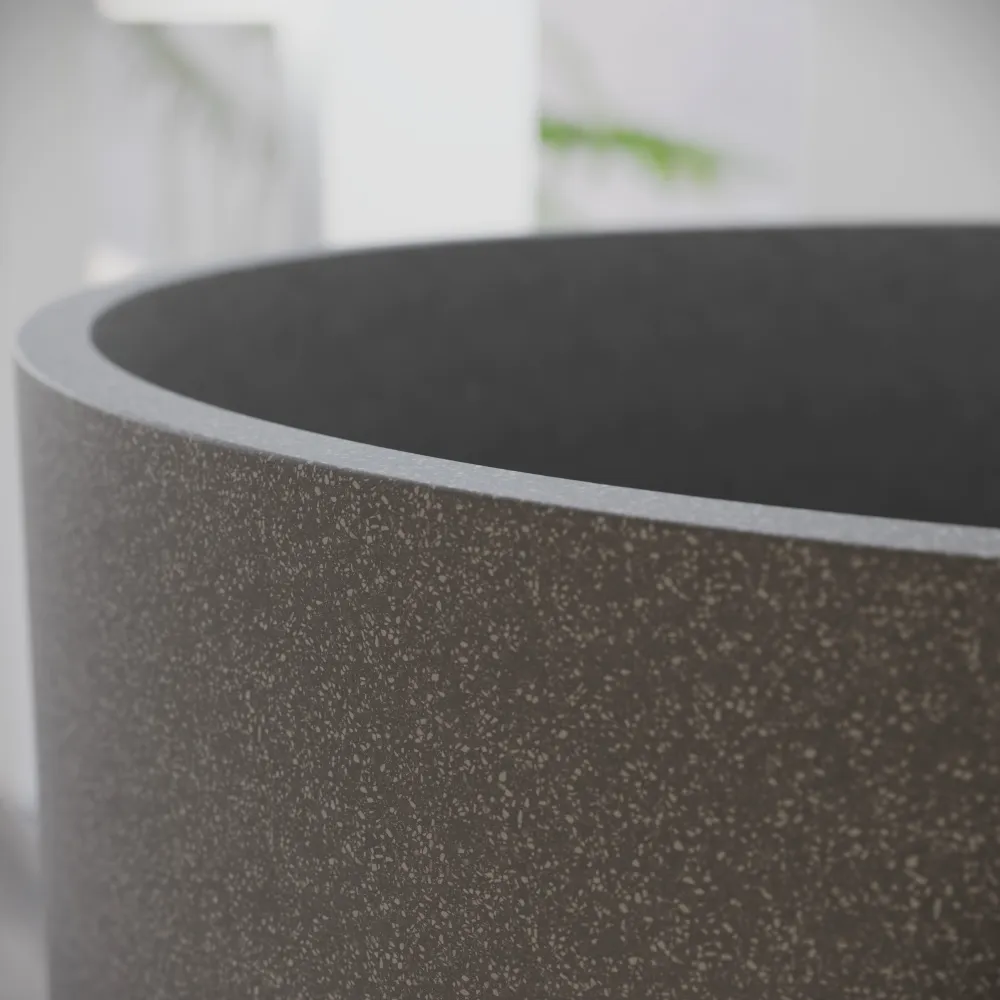 Il lavabo freestanding Coral in microcemento grigio scuro unisce eleganza e personalità in un design di grande impatto visivo. La finitura opaca effetto terrazzo dona profondità e carattere alla superficie, trasformando il lavabo in un autentico elemento di arredo.