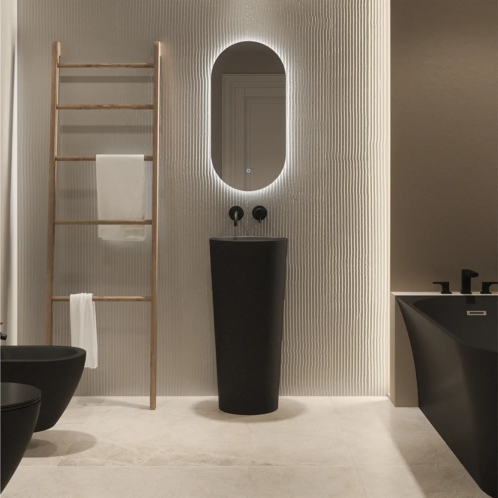 Il lavabo freestanding modello Egeo, con il suo diametro di 40 cm e la sua forma circolare, è un'opera d'arte che trasforma il tuo bagno in un'oasi di serenità. Realizzato in pregiata ceramica nera opaca, questo lavabo è un vero e proprio gioiello di design, capace di catturare l'attenzione e di donare un tocco di eleganza a qualsiasi ambiente.