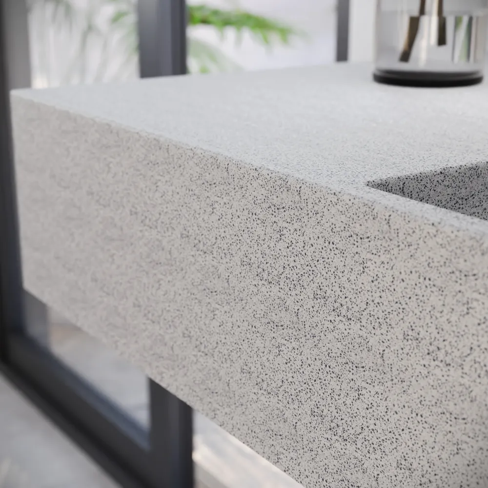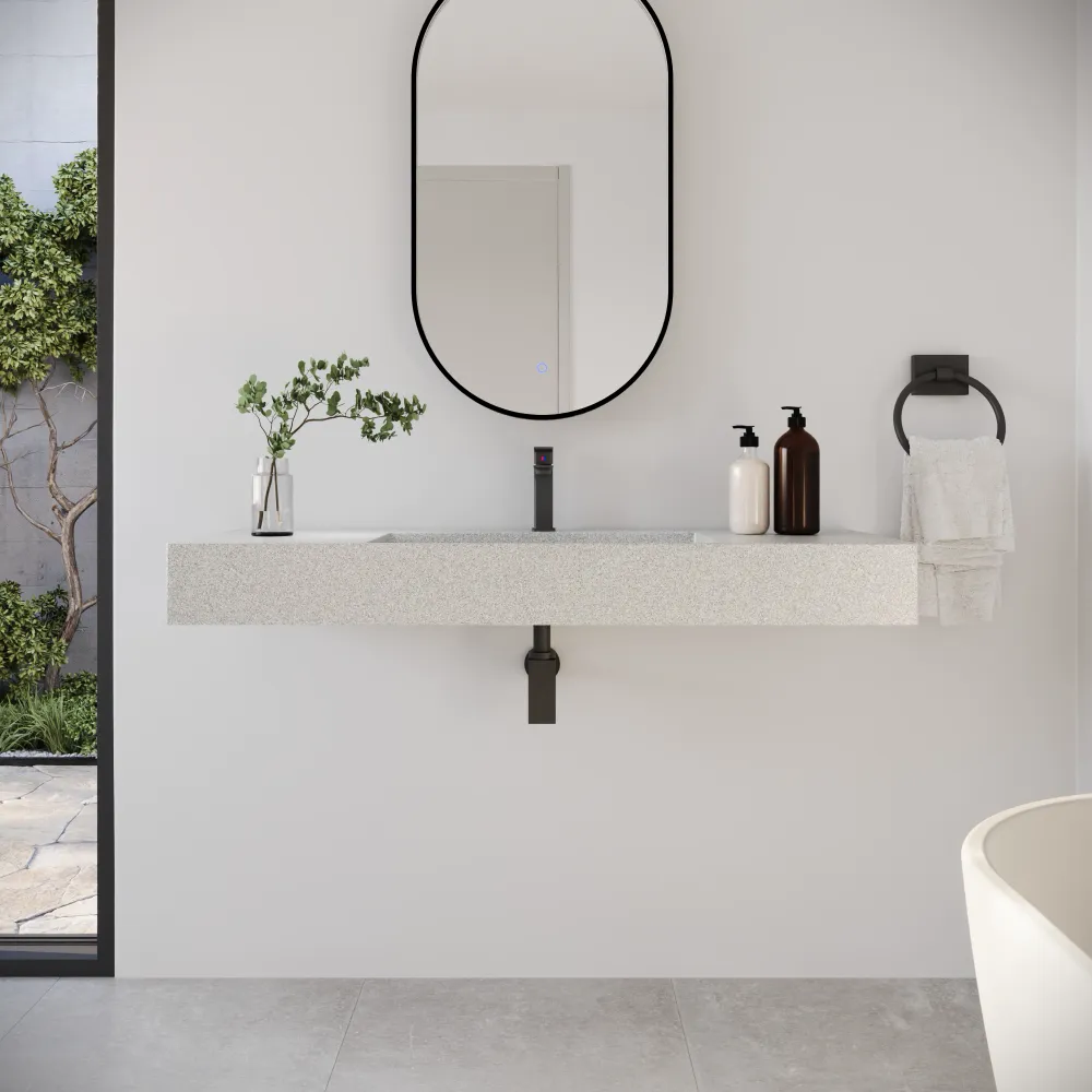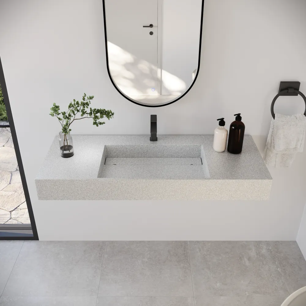 La struttura sospesa libera lo spazio inferiore, facilitando la pulizia e migliorando la percezione di ordine. La tonalità beige opaco, arricchita da microgranuli chiari, si abbina con eleganza a legno, pietra o arredi naturali, creando un ambiente caldo e contemporaneo.