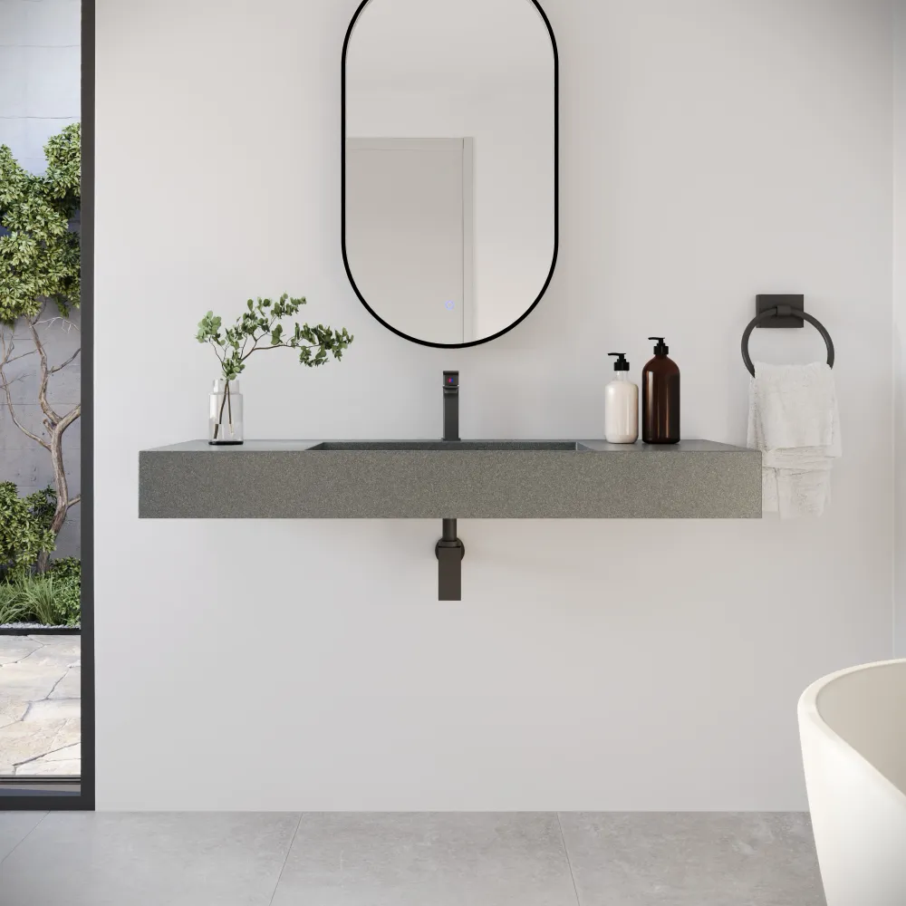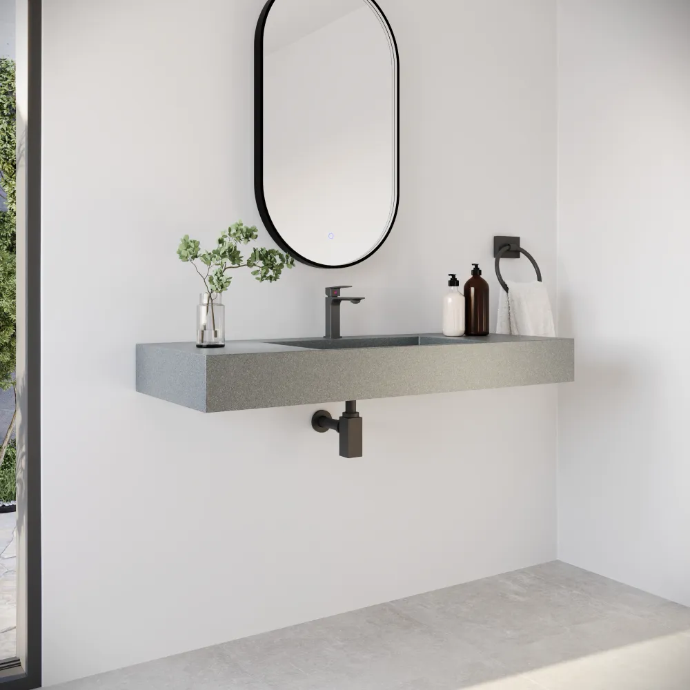 Il lavabo sospeso Tasman combina design architettonico e materiali materici in una soluzione dal forte impatto visivo. La sua installazione a muro esalta la purezza delle linee e la sensazione di leggerezza, rendendolo ideale per bagni moderni e spazi dallo stile industrial.
