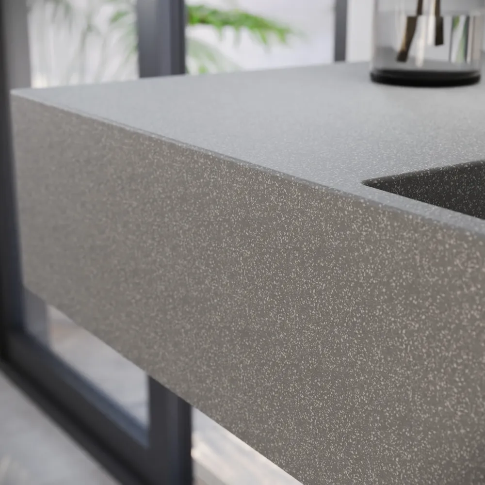 Realizzato in microcemento grigio con finitura opaca effetto terrazzo, il lavabo Tasman si distingue per la superficie compatta, impermeabile e gradevole al tatto. Un materiale che garantisce solidità, durabilità e resistenza all’uso quotidiano.