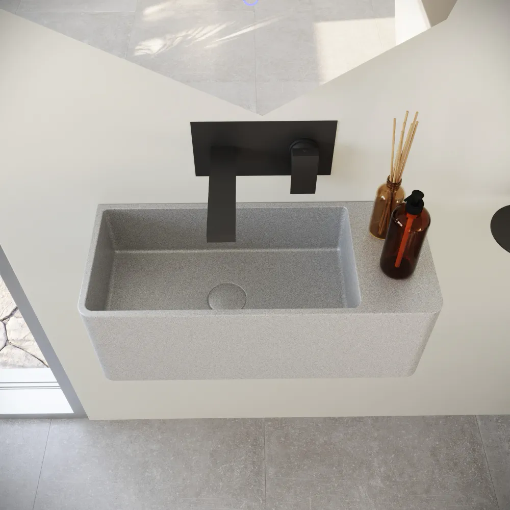 Realizzato in microcemento beige con una raffinata finitura opaca effetto terrazzo, il modello Kanas esprime uno stile deciso e sofisticato. Le sue linee rettangolari e compatte (55×23×20 cm) lo rendono perfetto per bagni di piccole e medie dimensioni, dove ogni dettaglio conta. Il foro per il rubinetto, posizionato a destra, aggiunge praticità e armonia visiva alla composizione.