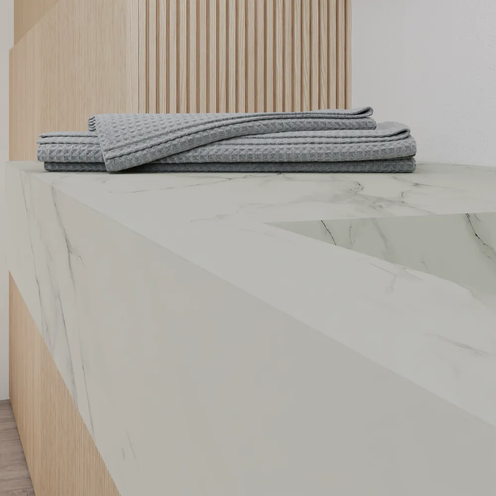 Scopri l'eleganza moderna del top da bagno sospeso Ledro, un capolavoro di design minimalista lungo 120 cm nel raffinato colore calacatta bianco. Realizzato in HPL, un materiale all'avanguardia che unisce l'estetica del marmo naturale alle performance superiori: superficie ultra-resistente ai graffi, al calore, all'umidità e alle macchie, con una finitura opaca setosa che riproduce fedelmente le venature del marmo Calacatta senza le fragilità del materiale originale.