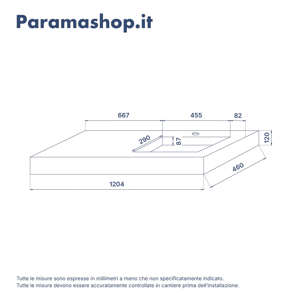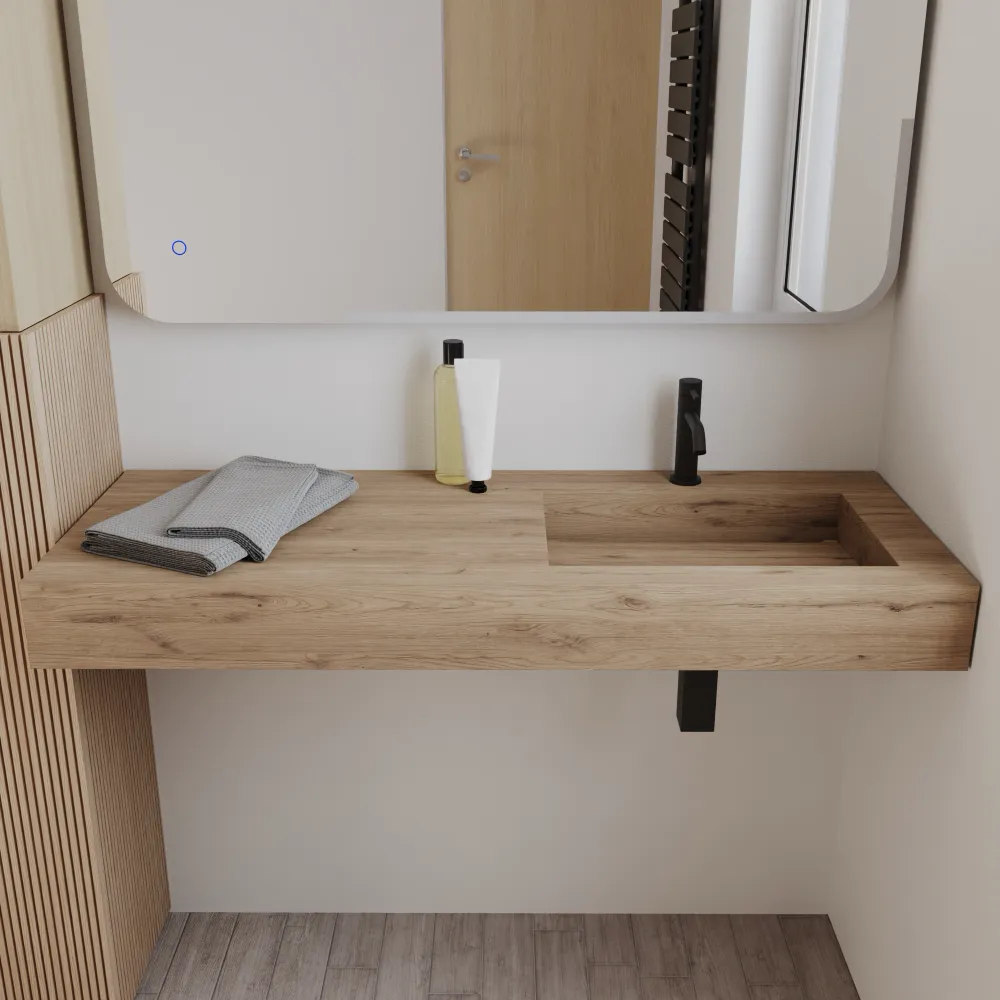 Il lavabo integrato – con vasca singola decentrata a destra da 29 x 45,5 x 8,7 cm, ergonomica e spaziosa – crea un piano continuo senza giunture, lasciando un ampio piano d'appoggio a sinistra per saponi, cosmetici o asciugamani. Si pulisce in un attimo, resiste a batteri e umidità grazie all'HPL leggerissimo ma indistruttibile. Ideale per installazioni sospese che massimizzano luminosità e praticità quotidiana, con uno stile impeccabile.