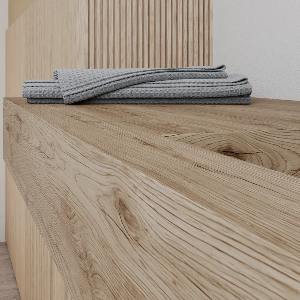 Scopri l'eleganza moderna del top da bagno sospeso Ledro, un capolavoro di design minimalista lungo 120 cm nel raffinato colore rovere miele. Realizzato in HPL, un materiale all'avanguardia che unisce l'estetica del marmo naturale alle performance superiori: superficie ultra-resistente ai graffi, al calore, all'umidità e alle macchie, con una finitura opaca setosa che riproduce fedelmente le venature del marmo Calacatta senza le fragilità del materiale originale.
