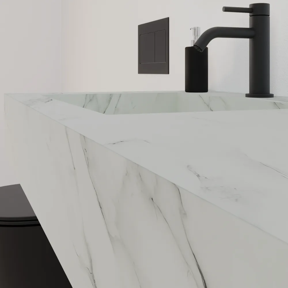 Scopri l'eleganza moderna del top da bagno sospeso Ledro, un capolavoro di design minimalista lungo 120 cm nel raffinato colore calacatta bianco. Realizzato in HPL, un materiale all'avanguardia che unisce l'estetica del marmo naturale alle performance superiori: superficie ultra-resistente ai graffi, al calore, all'umidità e alle macchie, con una finitura opaca setosa che riproduce fedelmente le venature del marmo Calacatta senza le fragilità del materiale originale.