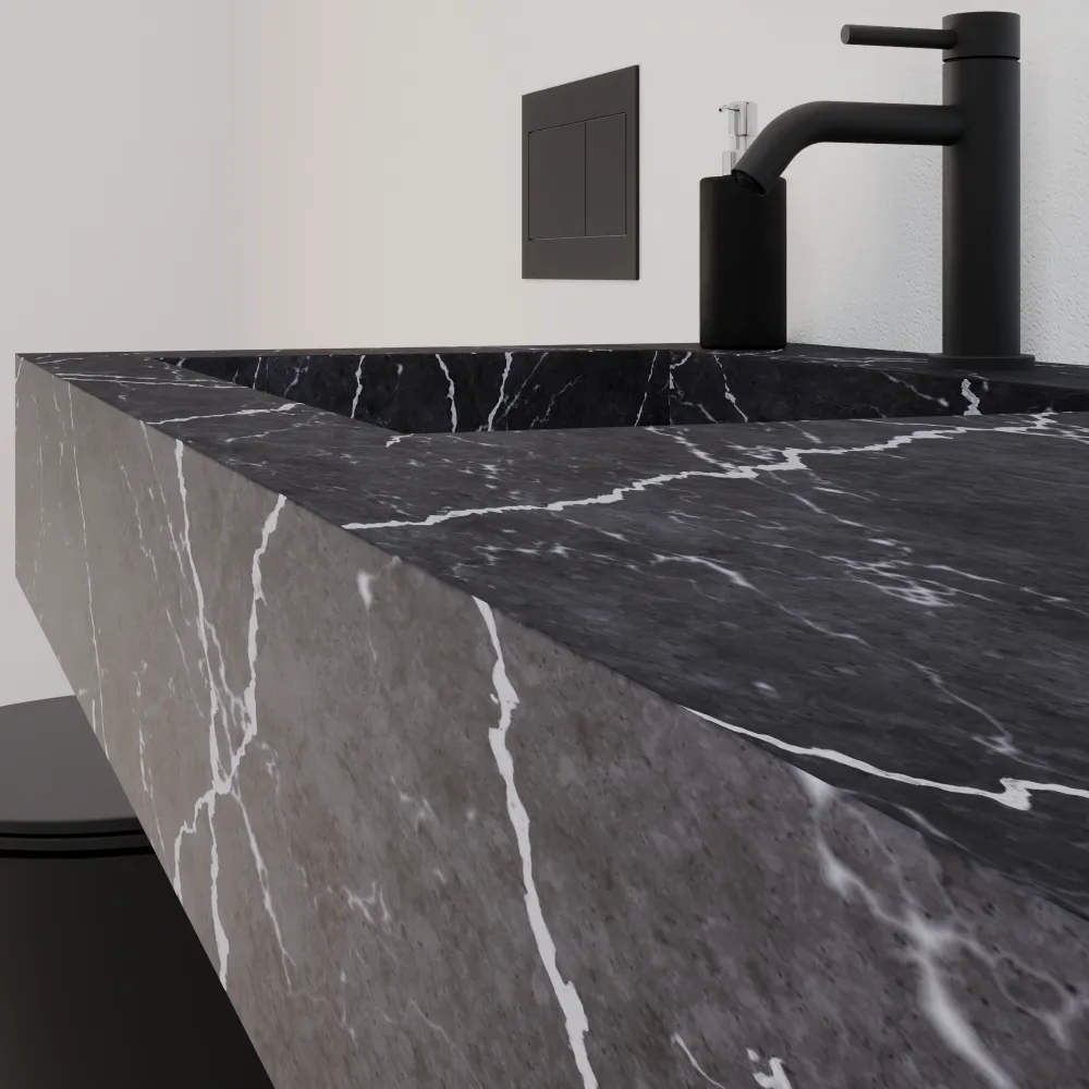Scopri l'eleganza moderna del top da bagno sospeso Ledro, un capolavoro di design minimalista lungo 120 cm nel raffinato colore marmo scuro. Realizzato in HPL, un materiale all'avanguardia che unisce l'estetica del marmo naturale alle performance superiori: superficie ultra-resistente ai graffi, al calore, all'umidità e alle macchie, con una finitura opaca setosa che riproduce fedelmente le venature del marmo Calacatta senza le fragilità del materiale originale.