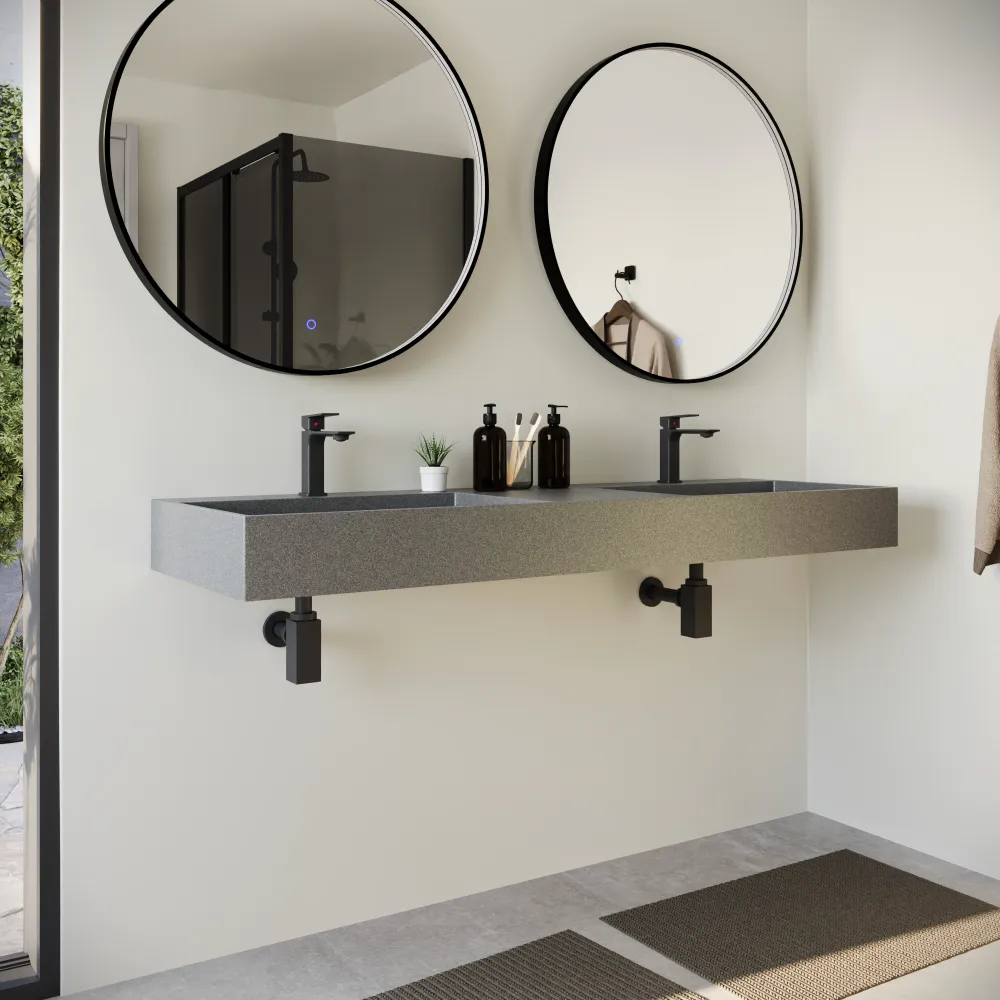 Il lavabo sospeso Tasman combina design architettonico e materiali materici in una soluzione dal forte impatto visivo. La sua installazione a muro esalta la purezza delle linee e la sensazione di leggerezza, ideale per bagni moderni e spazi dallo stile industrial.