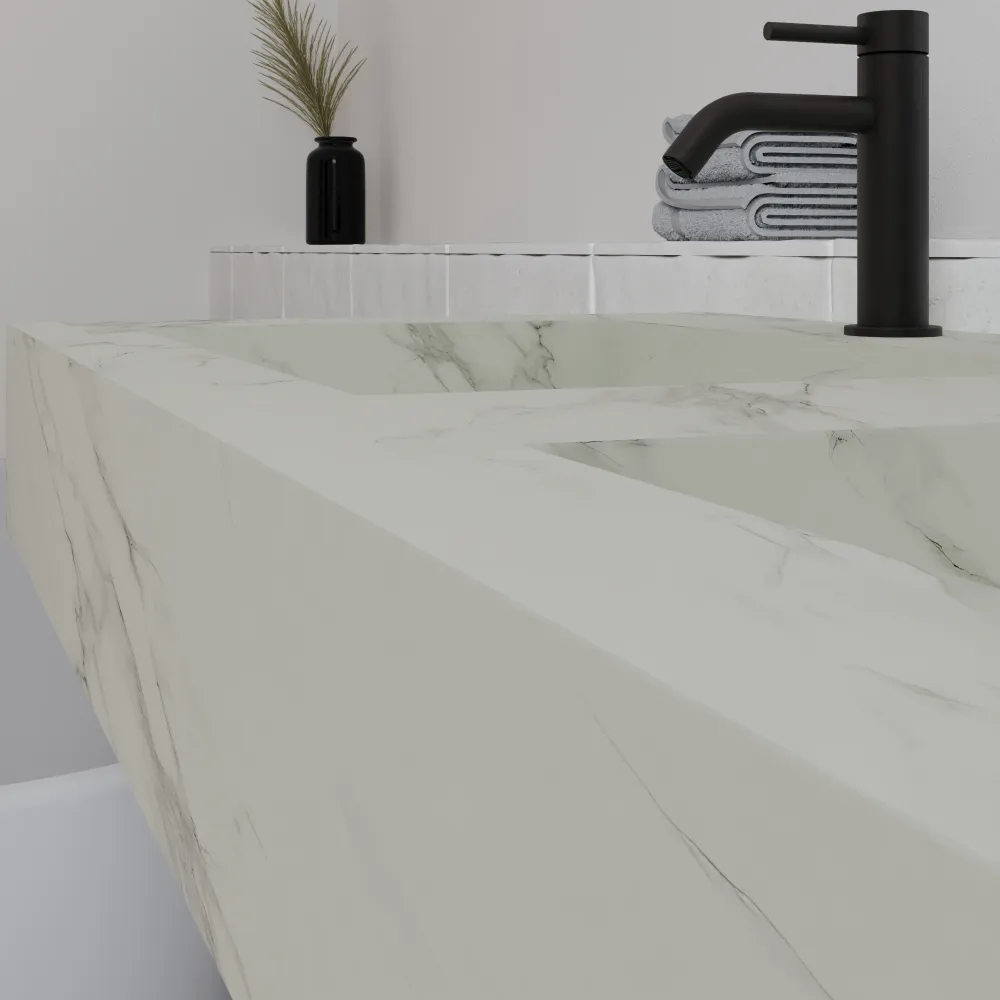 Scopri l'eleganza moderna del top da bagno sospeso Ledro, un capolavoro di design minimalista lungo 120 cm nel raffinato colore calacatta bianco. Realizzato in HPL, un materiale all'avanguardia che unisce l'estetica del marmo naturale alle performance superiori: superficie ultra-resistente ai graffi, al calore, all'umidità e alle macchie, con una finitura opaca setosa che riproduce fedelmente le venature del marmo Calacatta senza le fragilità del materiale originale.