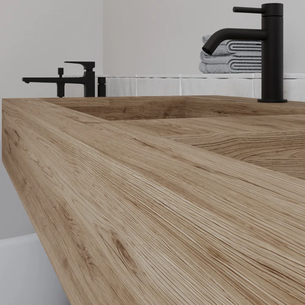 Il lavabo integrato doppio crea un piano continuo e senza giunture, perfetto per bagni contemporanei o minimalisti condivisi. Ogni vasca misura 29 x 45,5 x 8,7 cm – ergonomiche, spaziose e simmetriche per un uso simultaneo comodo – e si pulisce in un attimo, resistendo a batteri e umidità grazie all'HPL leggerissimo ma indistruttibile. Ideale per installazioni sospese che massimizzano luminosità e spazio, con uno stile impeccabile.