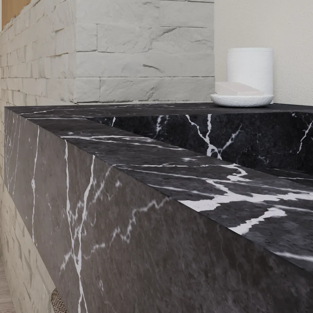 Scopri l'eleganza moderna del top da bagno sospeso Ledro, un capolavoro di design minimalista lungo 100 cm nel raffinato colore marmo scuro. Realizzato in HPL, un materiale all'avanguardia che unisce l'estetica del marmo naturale alle performance superiori: superficie ultra-resistente ai graffi, al calore, all'umidità e alle macchie, con una finitura opaca setosa che riproduce fedelmente le venature del marmo Calacatta senza le fragilità del materiale originale.