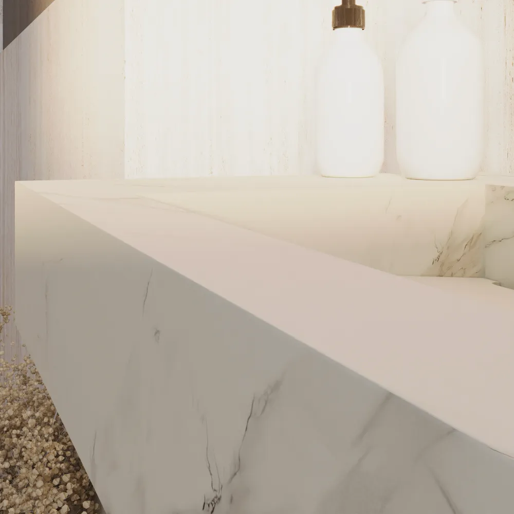 Scopri l'eleganza moderna del top da bagno sospeso Ledro, un capolavoro di design minimalista lungo 80 cm nel raffinato colore calacatta bianco. Realizzato in HPL, un materiale all'avanguardia che unisce l'estetica del marmo naturale alle performance superiori: superficie ultra-resistente ai graffi, al calore, all'umidità e alle macchie, con una finitura opaca setosa che riproduce fedelmente le venature del marmo Calacatta senza le fragilità del materiale originale.
