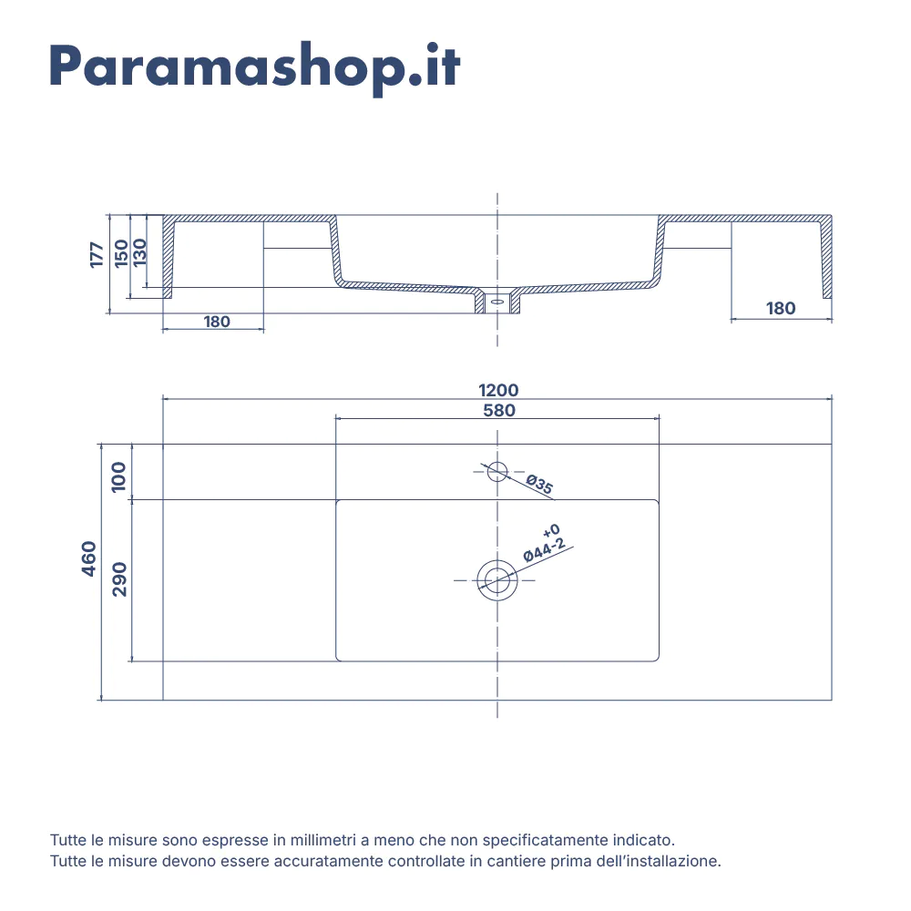 - Foro rubinetto: Preforato (segni guida sul retro per eventuale foratura)
