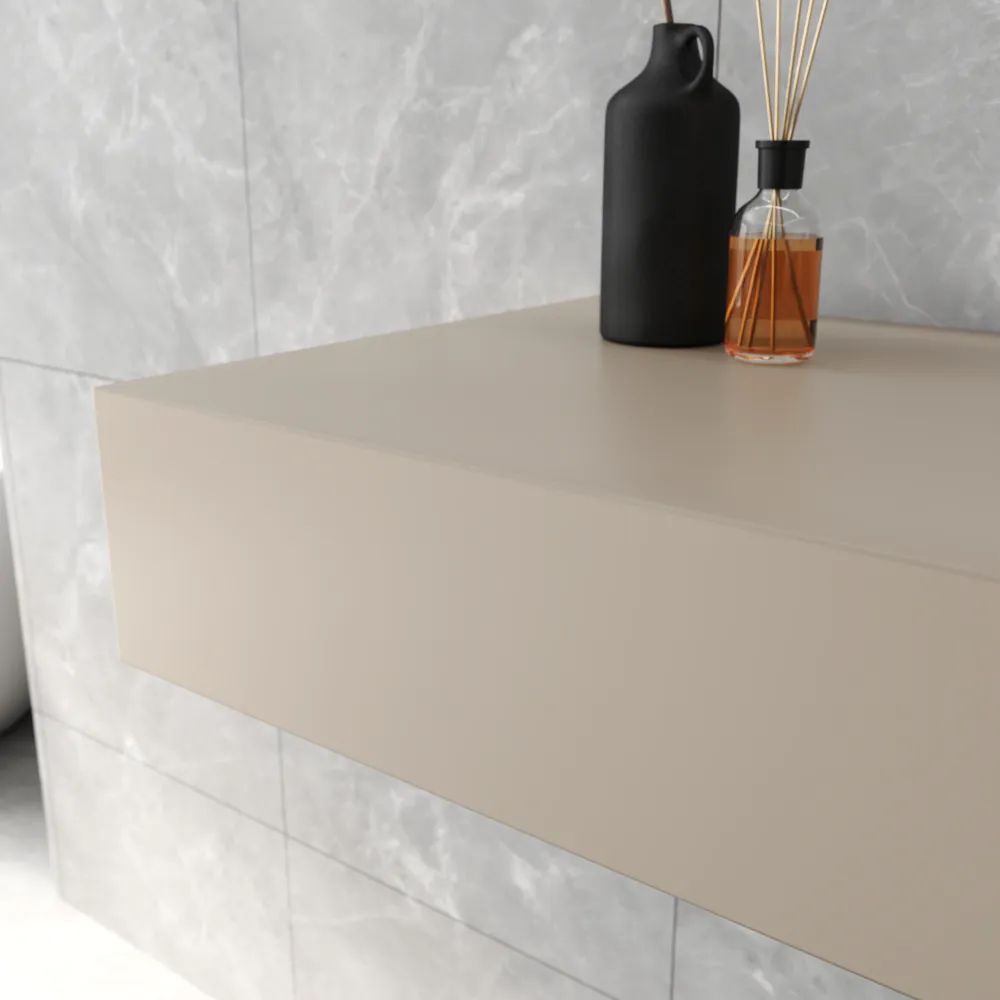 Realizzato in Marmoresina, un materiale composito di alta qualità, questo lavabo garantisce robustezza e durata nel tempo. La finitura liscia e opaca nella decisa tonalità beige offre un effetto "soft-touch" estremamente elegante, conferendo al bagno un aspetto sofisticato e contemporaneo.