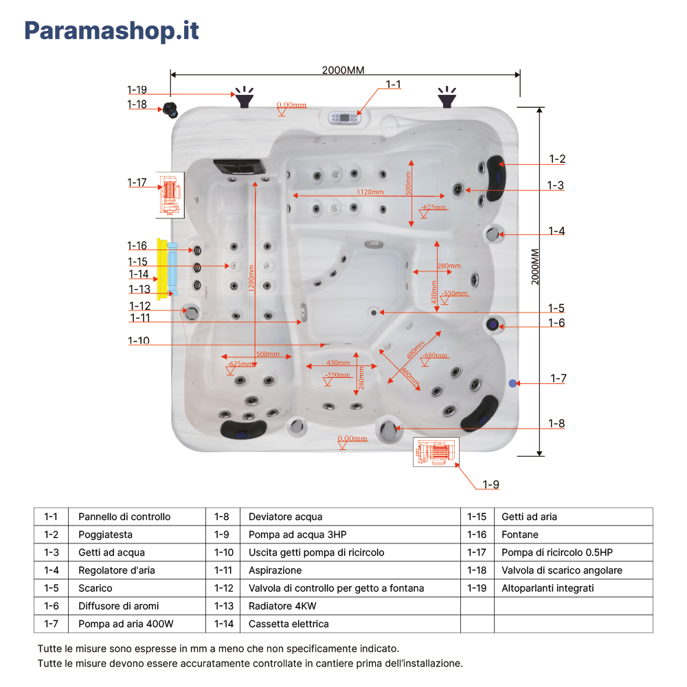 La potenza del modello Bled si manifesta attraverso una pompa ad aria da 400W, un riscaldatore da 4KW e una pompa ad acqua da 3HP, garantendo prestazioni eccezionali per un'idromassaggio senza rivali.