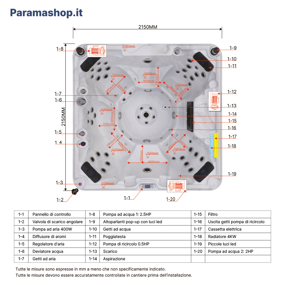 La potenza di questo modello Garda si manifesta attraverso una pompa ad aria da 400W, un riscaldatore da 4KW e pompe ad acqua da 2,5HP e 2HP, garantendo prestazioni eccezionali per un'idromassaggio senza rivali.